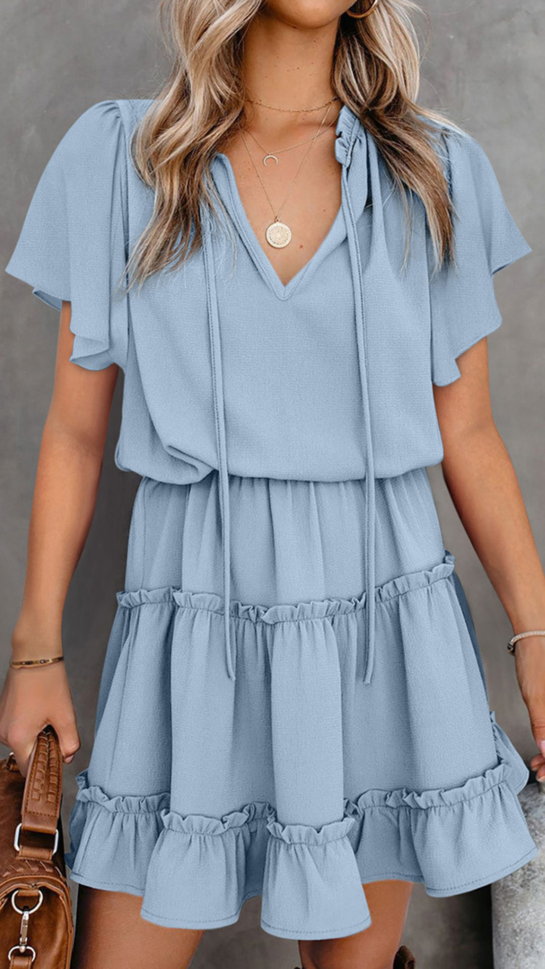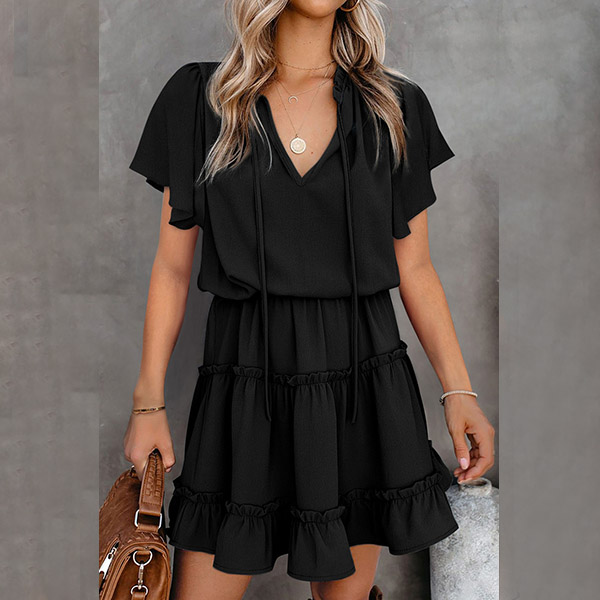 You've got a busy schedule and lots to do, so getting dressed in the morning shouldn't be a cause for stress. Your daily routine can be made much easier with this dress. Comes with a solid color,the v-neck,lotus sleeve and ruffle hem design give you the chance to exude your charming feminine appeal. You just need to match it with your favourite heels,then you can look beautiful enough!