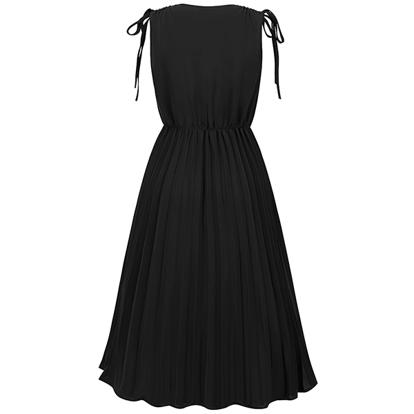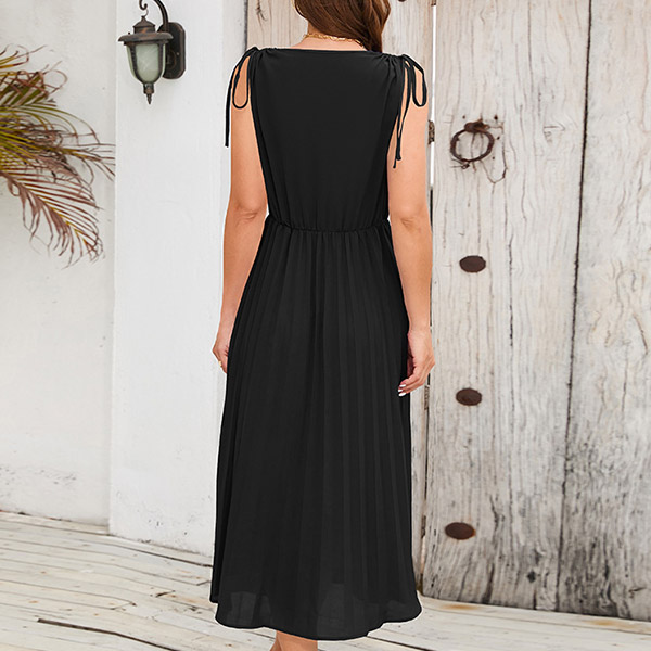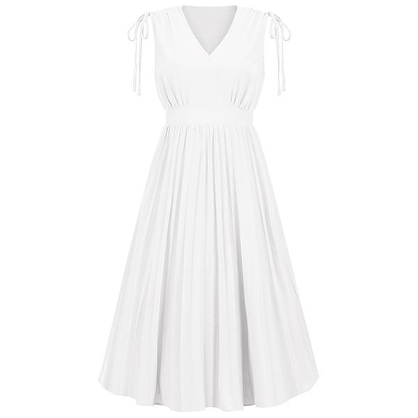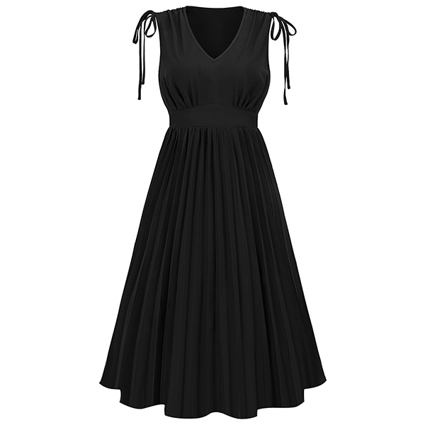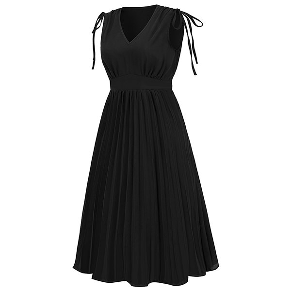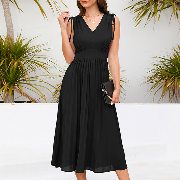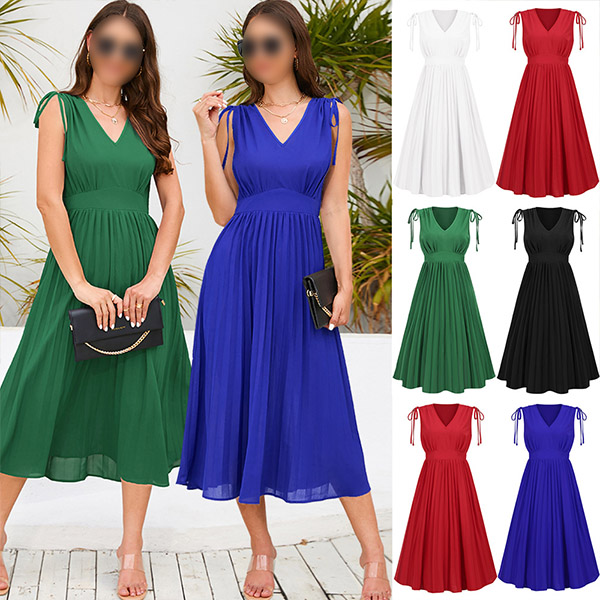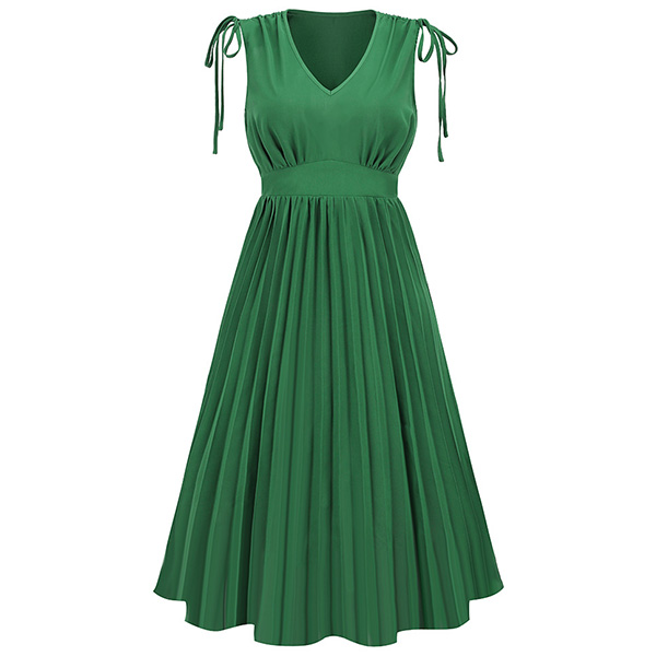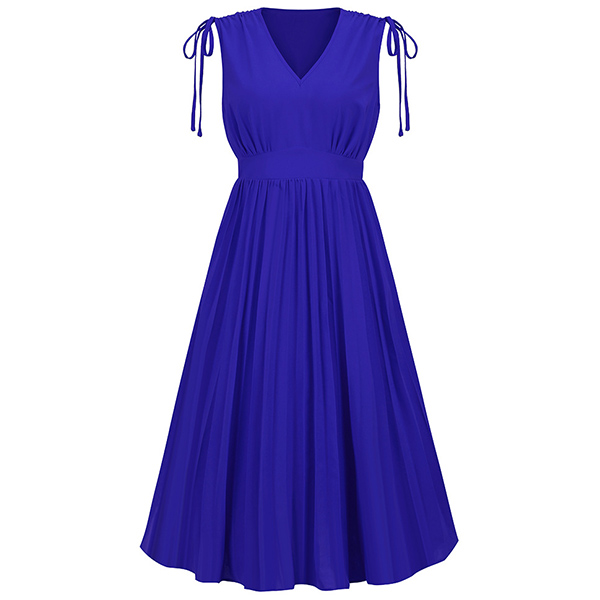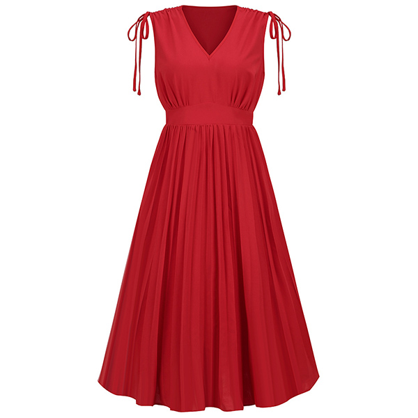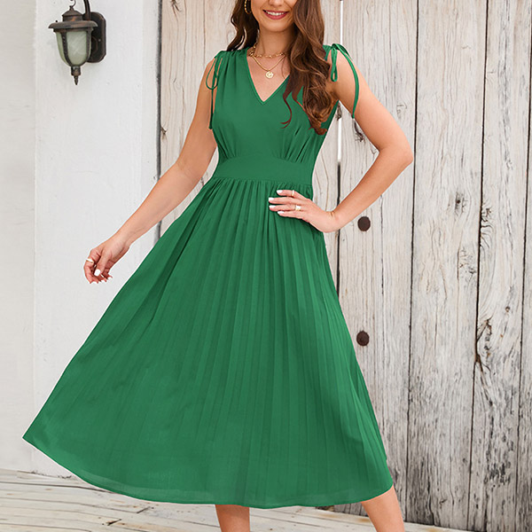 How about this dress? The solid color design is accented by a flattering V-neck cut, creating a timeless and chic look. The pleated design adds movement and volume, while the fitted bodice and flowy skirt create a flattering silhouette.