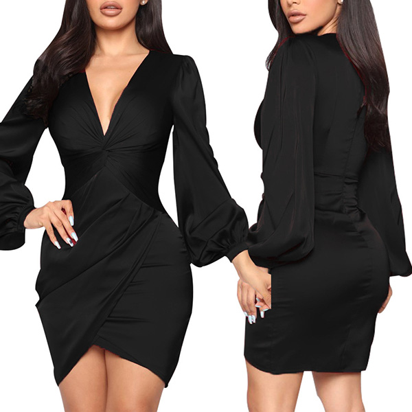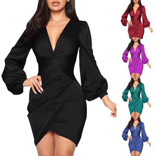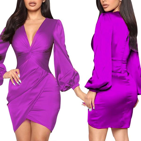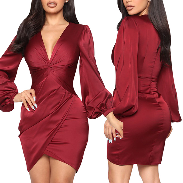Fashion Solid Color V-neck Ruched Irregular Hemline Bodycon Dress
