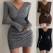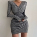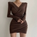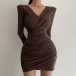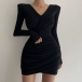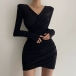 Fashion Solid Color V-neck Ruched Long Sleeve Bodycon Dress