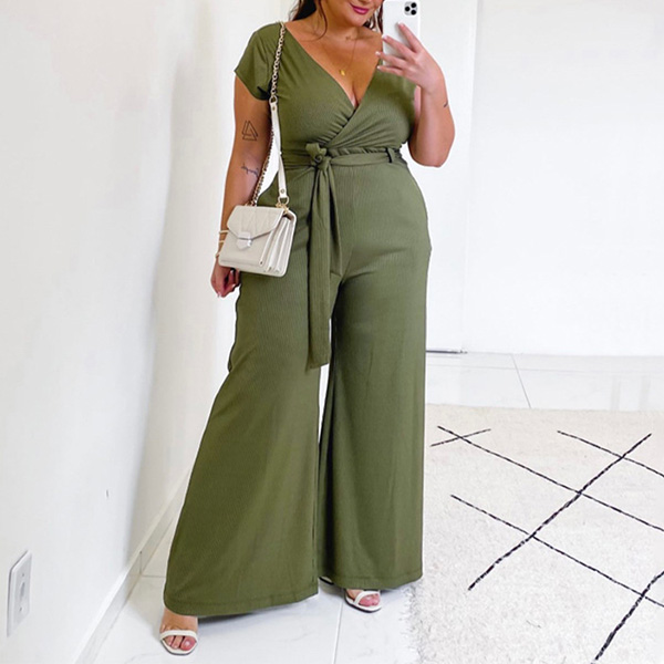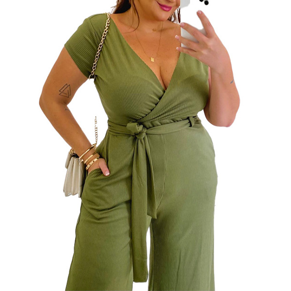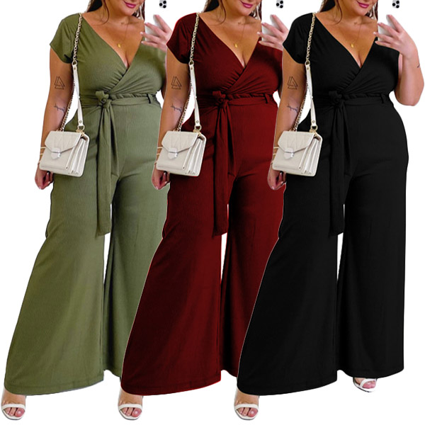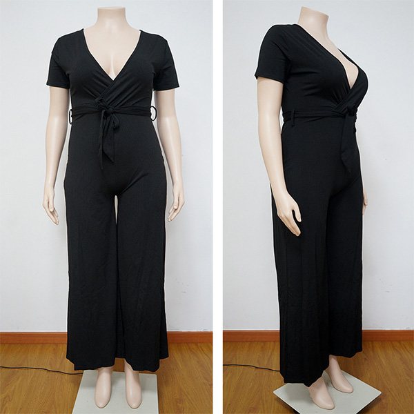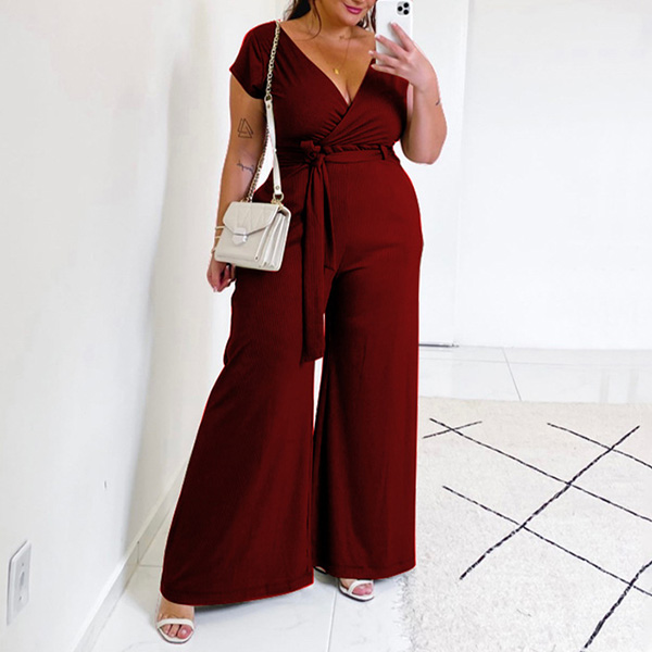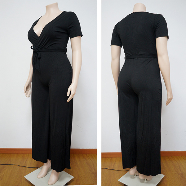 Fashion Solid Color V-neck Self-tie Wide-leg Oversize Plus Size Jumpsuit