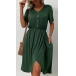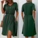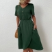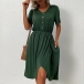 Fashion Solid Color V-neck Short Sleeve Buttoned Pleated Slit Irregular Hemline Dress