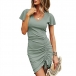 Fashion Solid Color V-neck Short Sleeve Drawstring Ruched Bodycon Dress