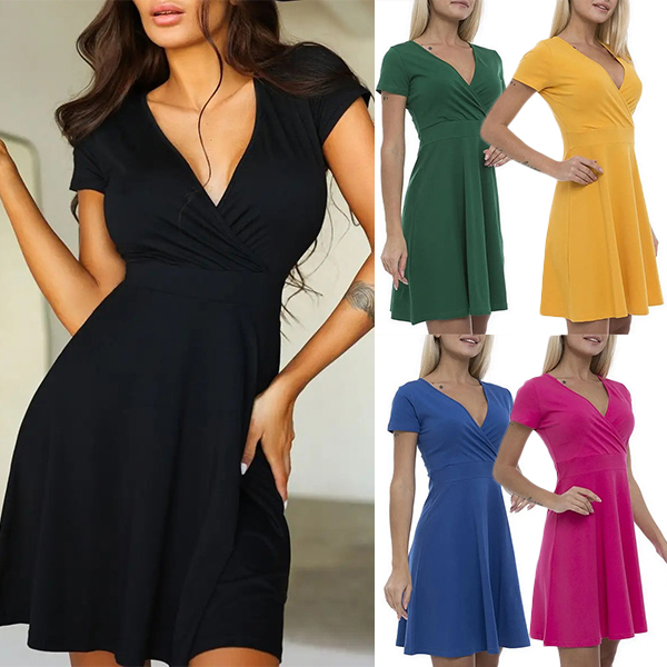 This stylish mini dress features a classic v-neck silhouette, short sleeves, and a bold, solid color design. Multi-colors avabile.