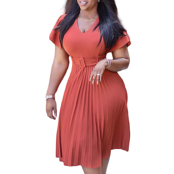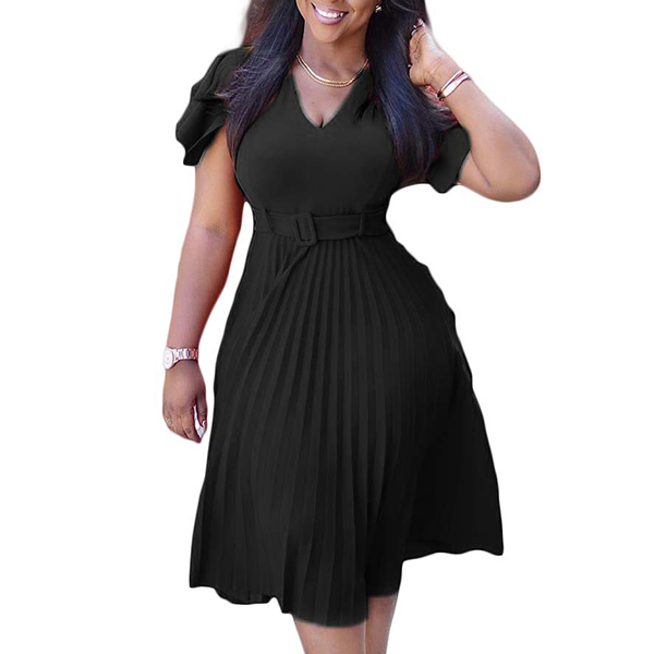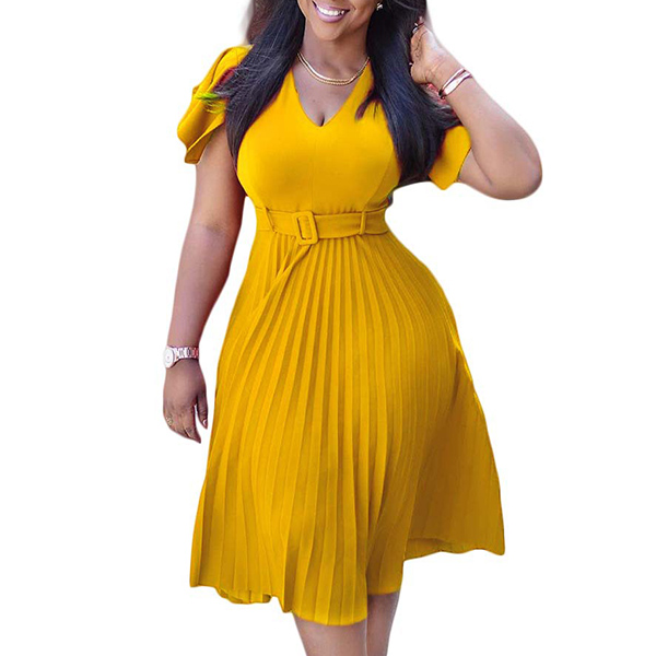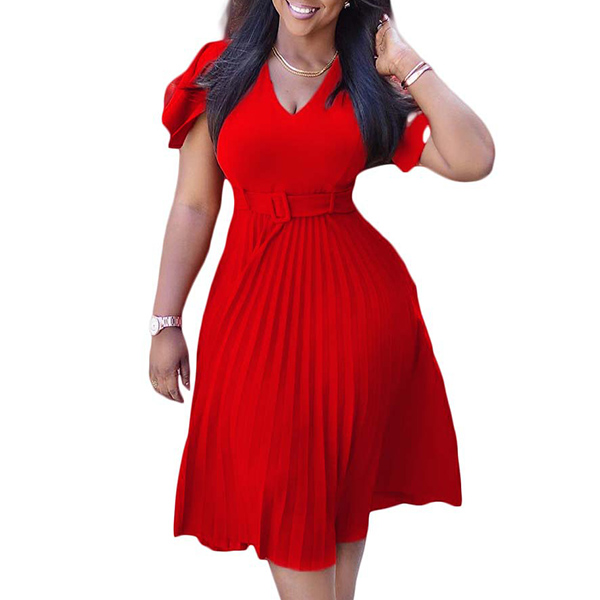 Fashion Solid Color V-neck Short Sleeve Pleated Dress