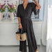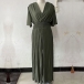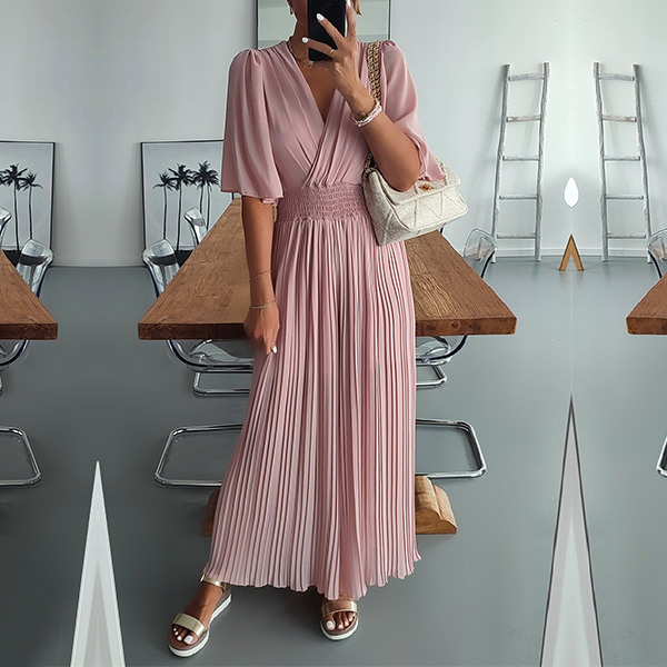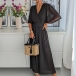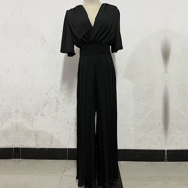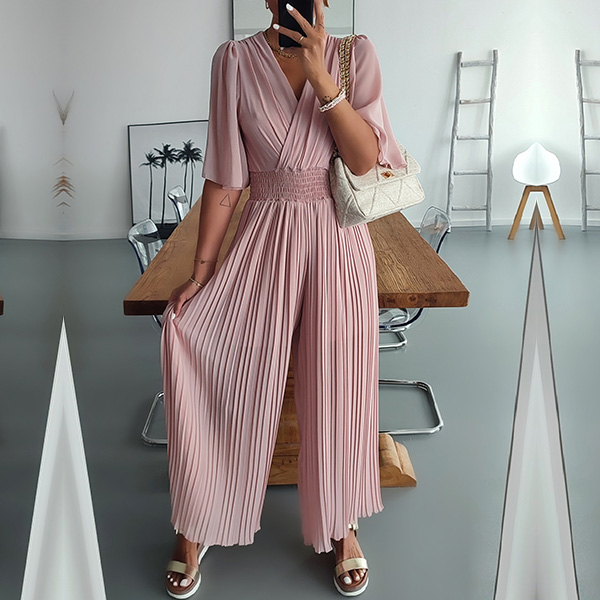 Fashion Solid Color V-neck Short Sleeve Pleated Jumpsuit