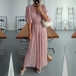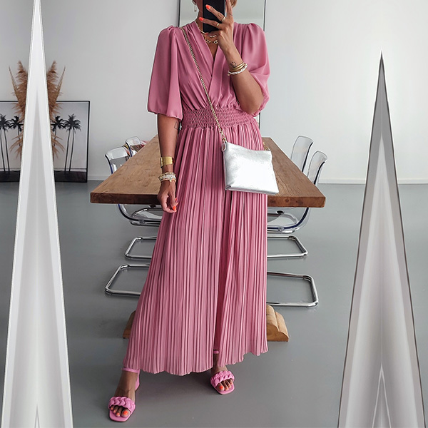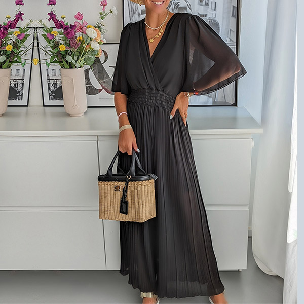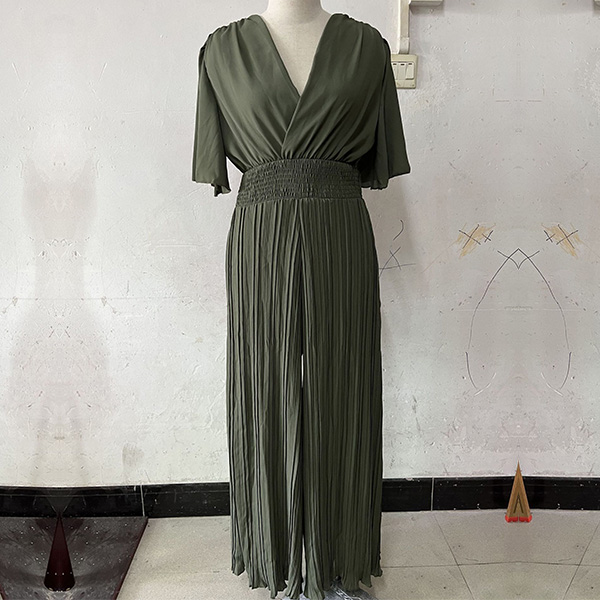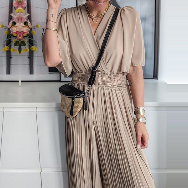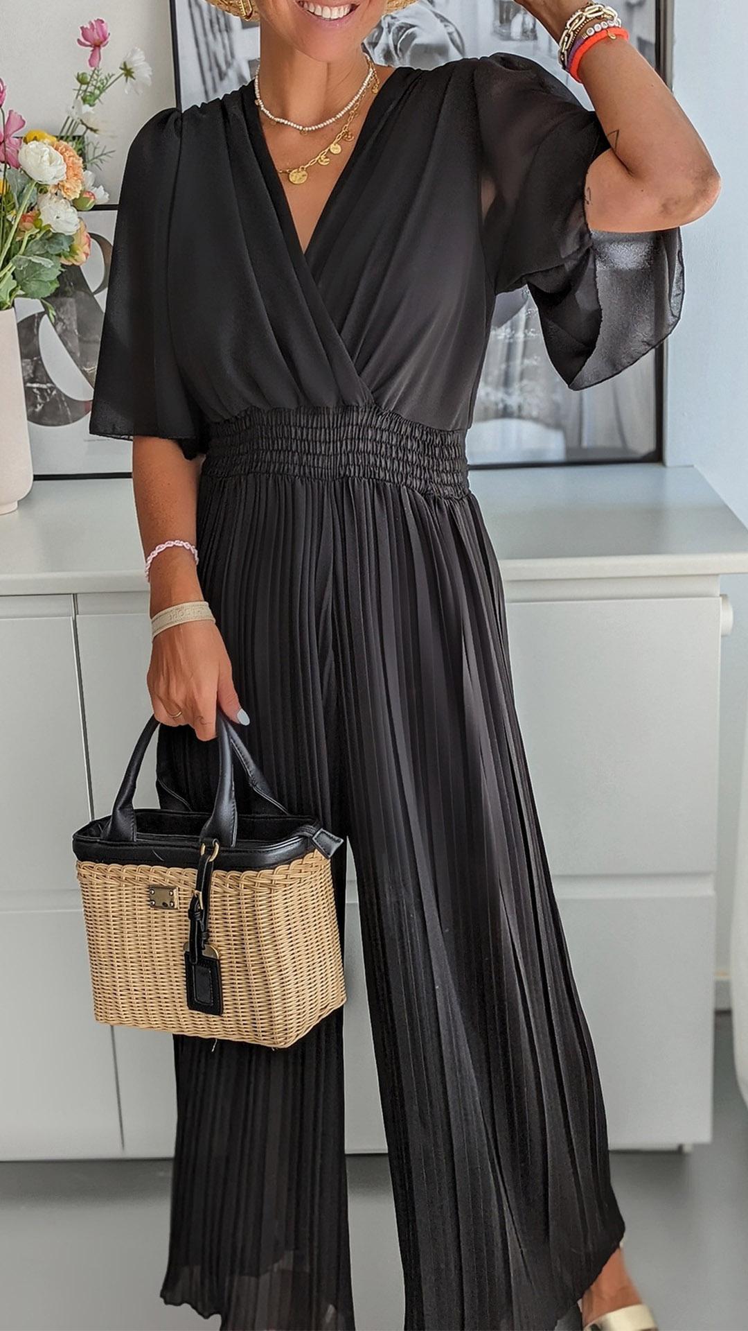 This jumpsuit is the perfect combination of comfort and sophistication, making it a versatile and stylish addition to your wardrobe. The V-neckline adds a flattering and feminine element, beautifully framing your décolletage. The pleated detailing adds texture and visual interest, creating a chic and elegant look. Made from high-quality fabric, this jumpsuit feels soft and breathable against your skin, making it perfect for all-day wear.