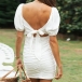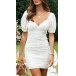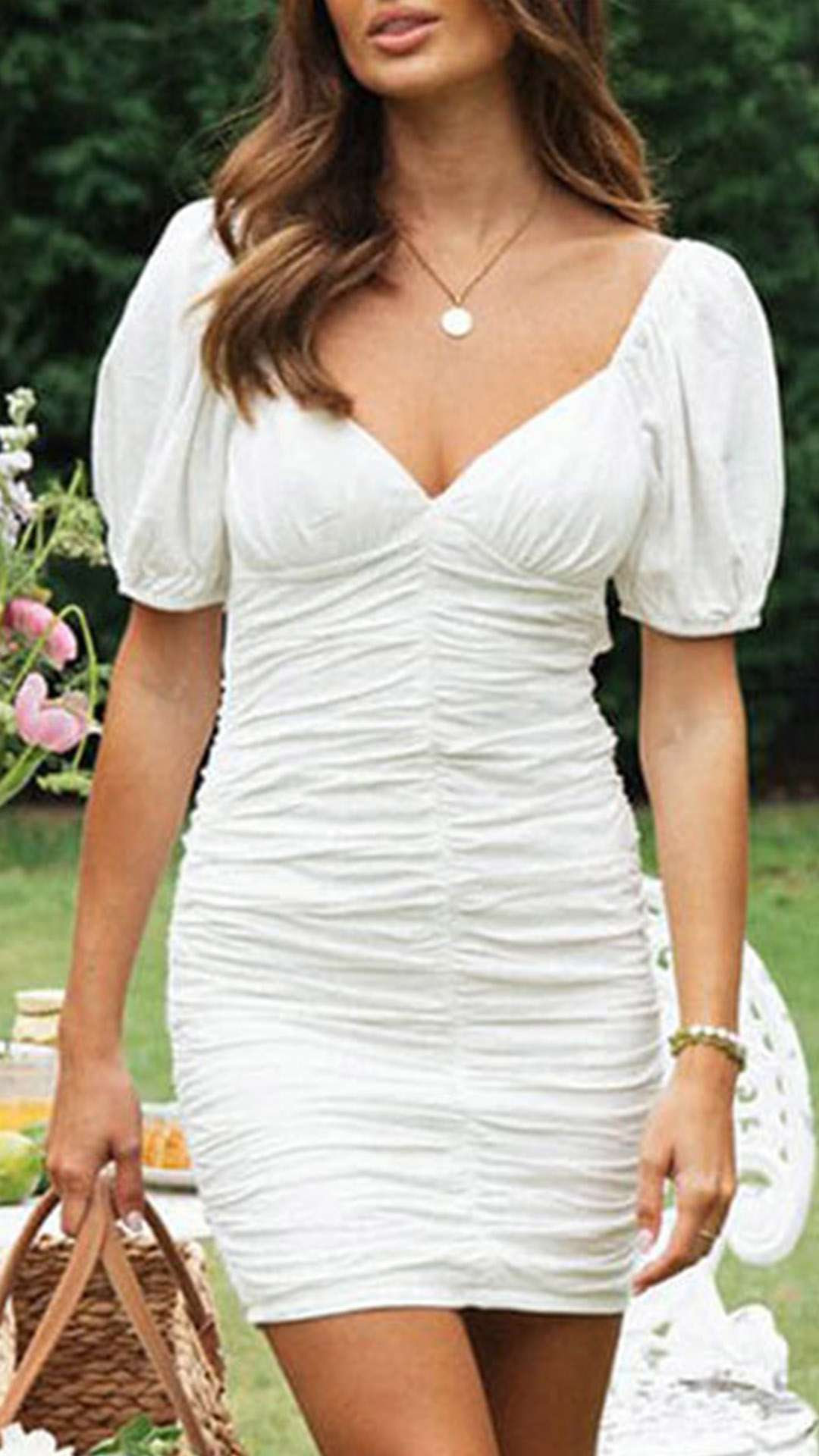 This white dress with a V-neck, short sleeves ruched details and bodycon silhouette, it look like a chic and figure-flattering piece!