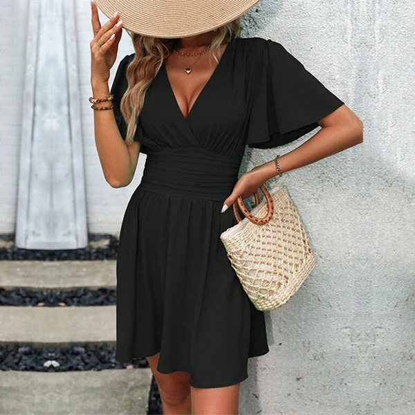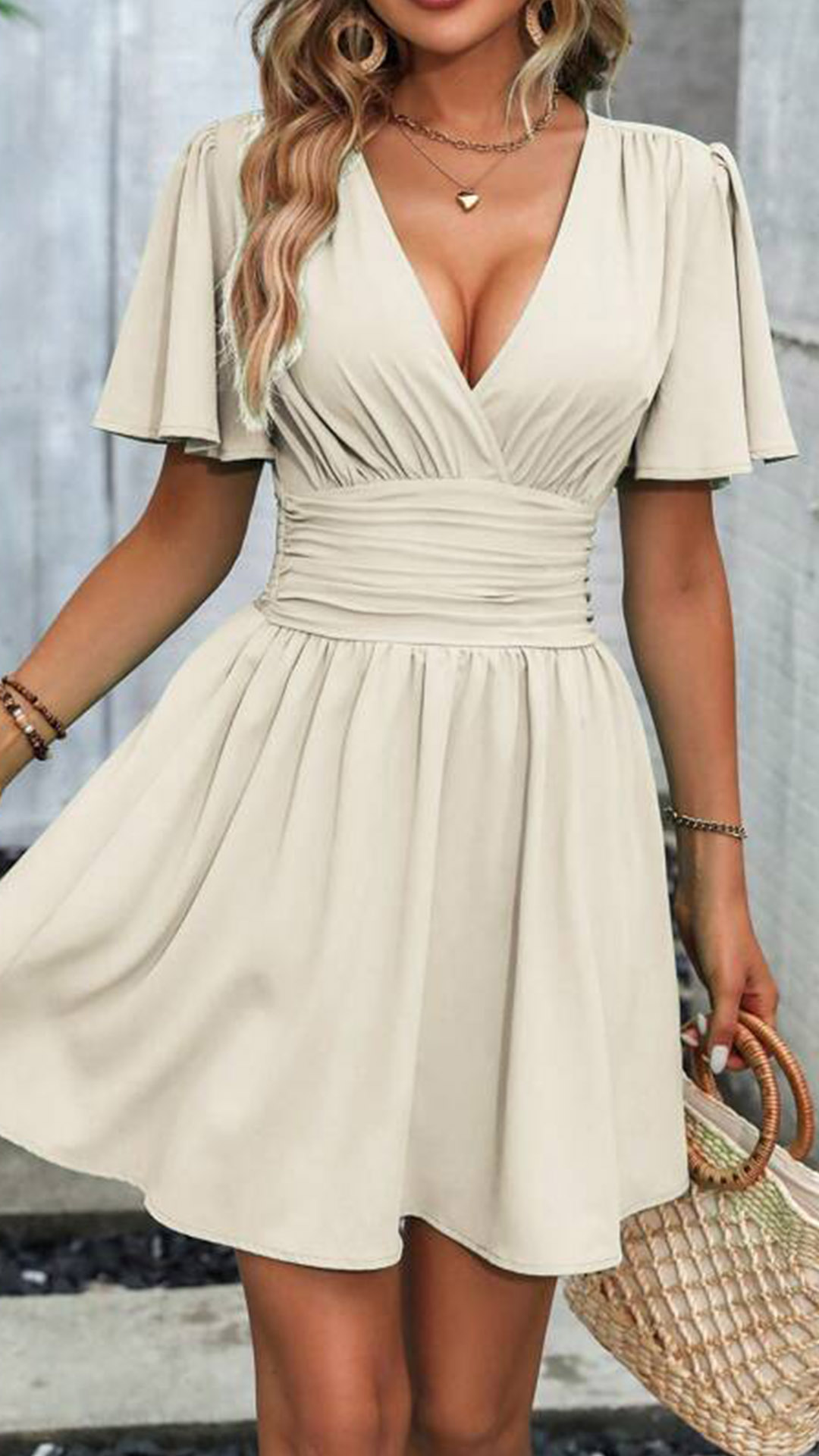 Fashion Solid Color V-neck Short Sleeve Ruched Cinch Waist Mini Dress