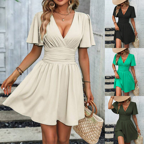 Featuring a solid color account, V-neckline, ruffled short sleeves, and ruched detailing along the cinched waist, this dress is a versatile and stylish option that can be dressed up or down.