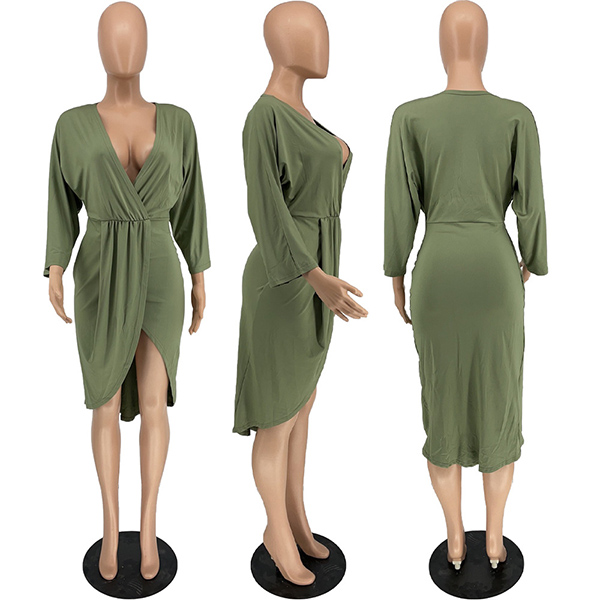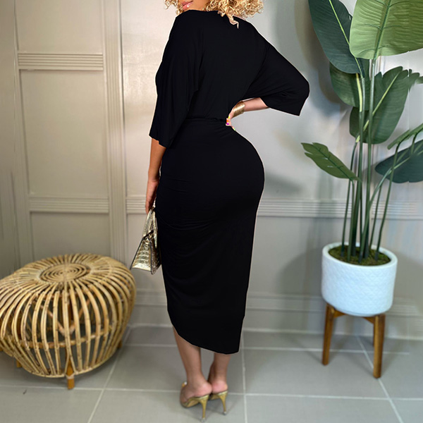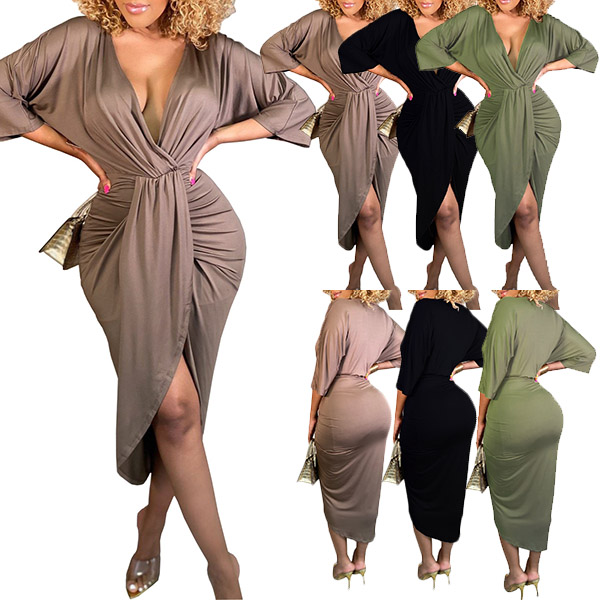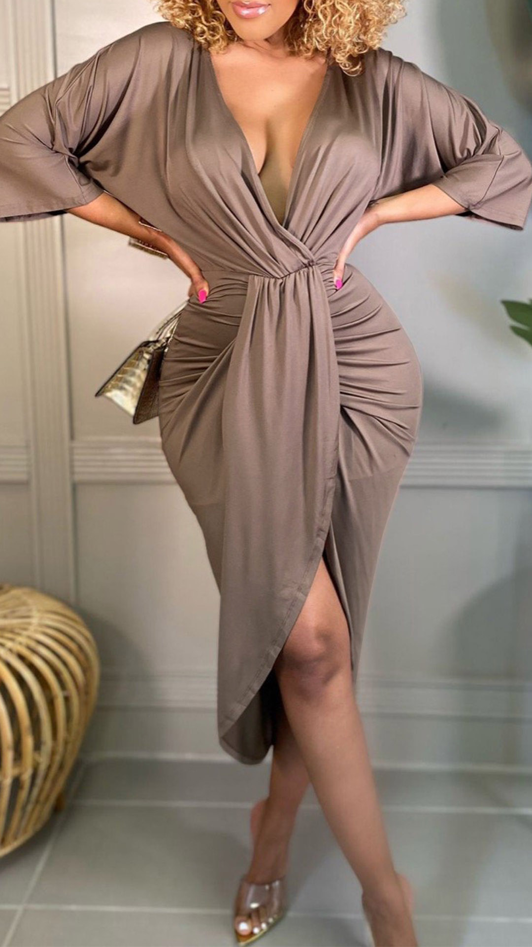 This is a beautiful and elegant dress that is perfect for any formal or special occasion. It features a V-neckline, short sleeves, and a ruched design with a slit skirt. This dress is sure to become a favorite in your wardrobe.