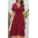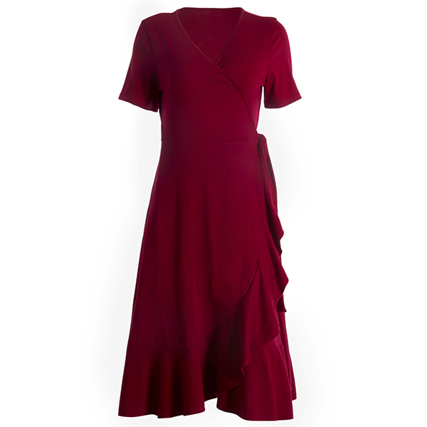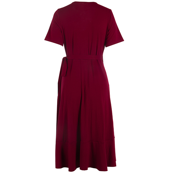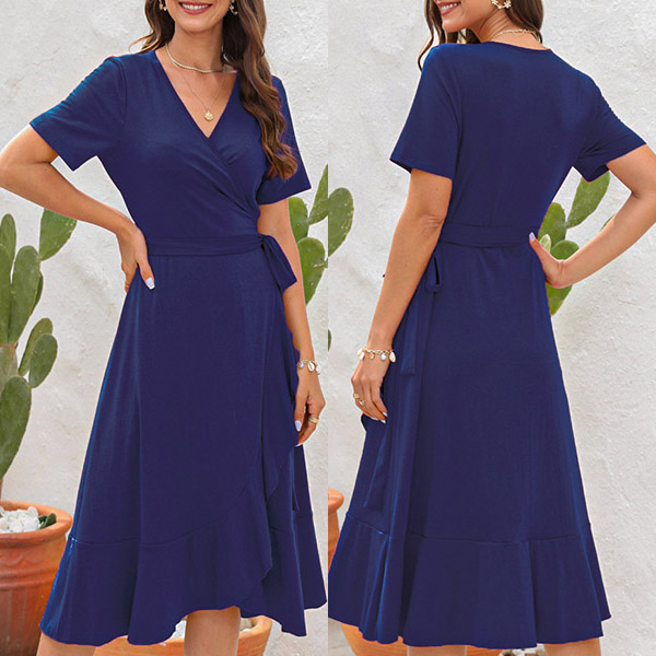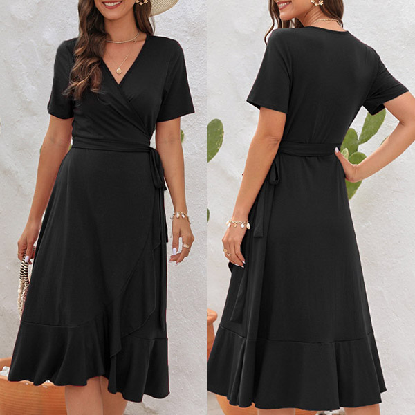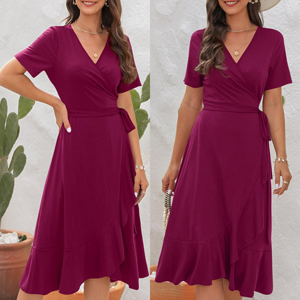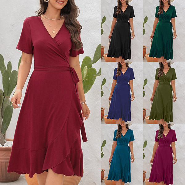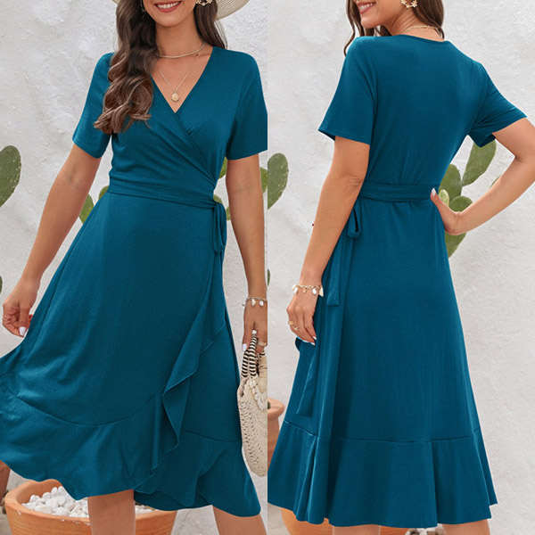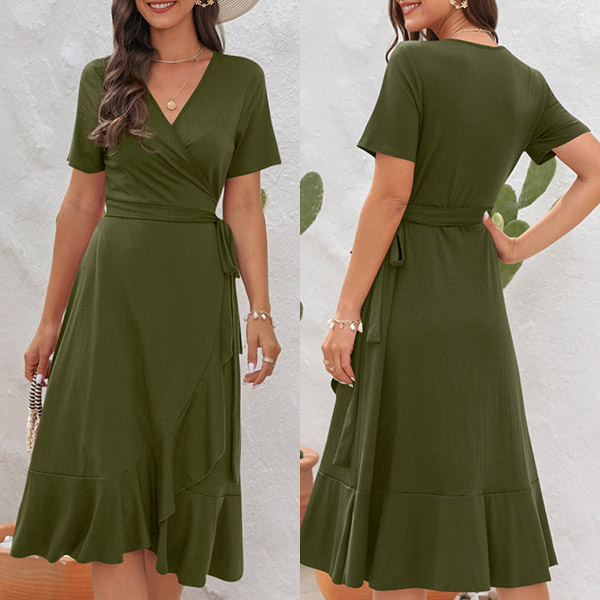 This dress is a perfect blend of fashion and femininity. With its solid color design, V-neckline, short sleeves, ruffled details, and wrap style, it exudes a sense of elegance and style.
