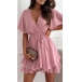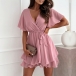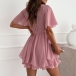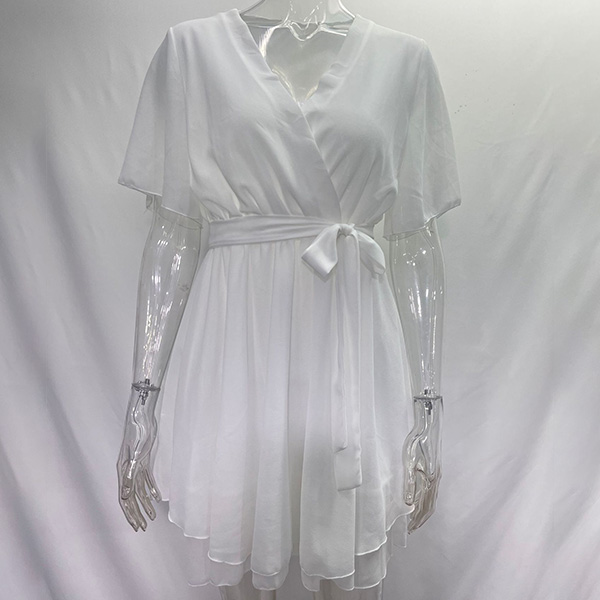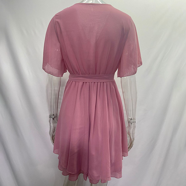 Fashion Solid Color V-neck Short Sleeve Self-tie Waist Chiffon Dress