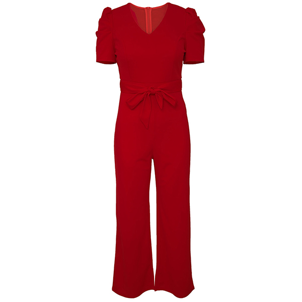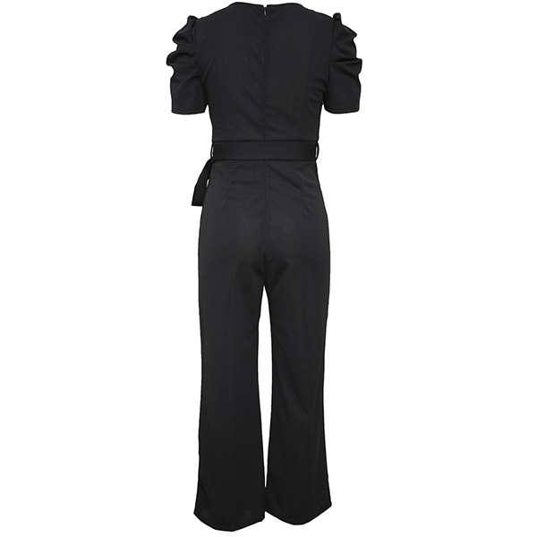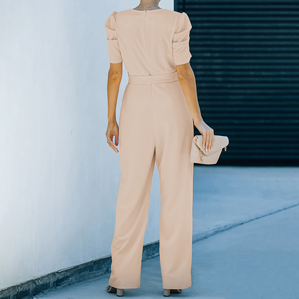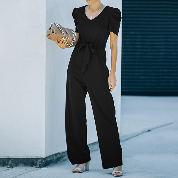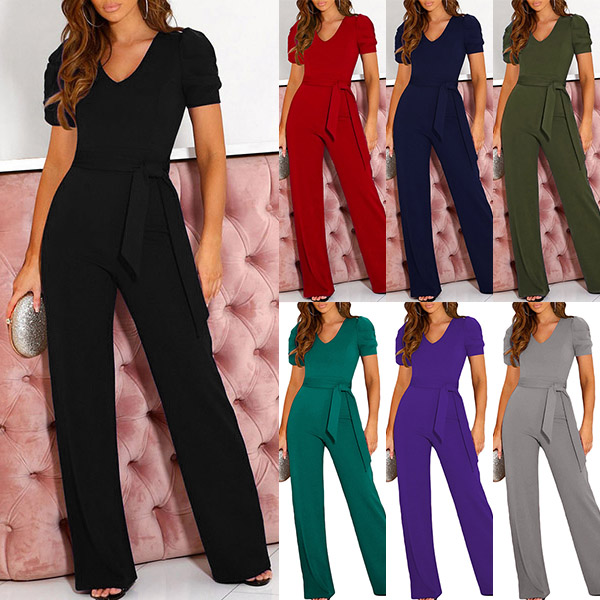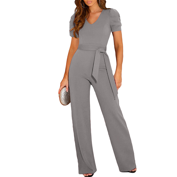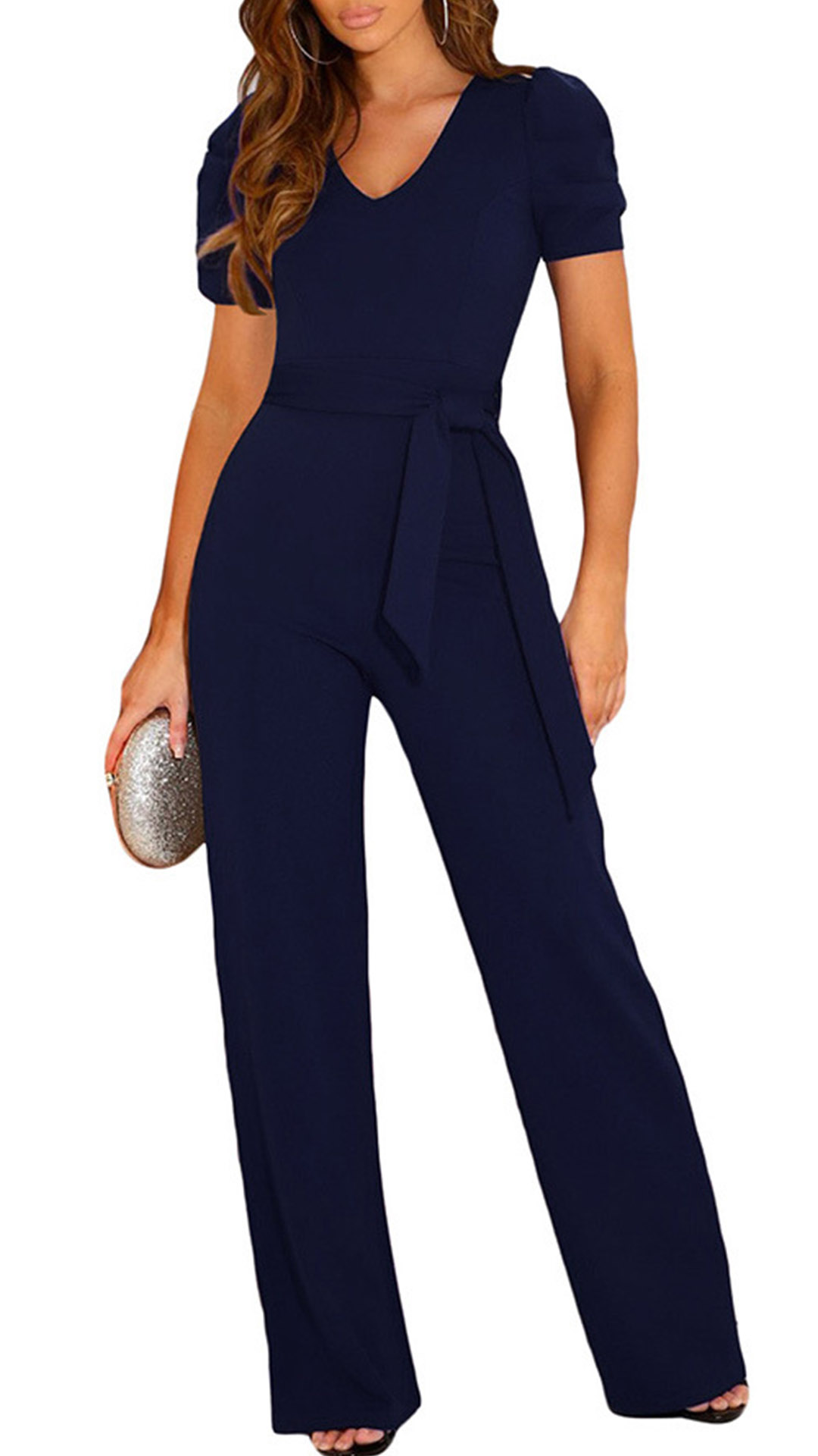 A solid color jumpsuit featuring V-neck, short sleeve, high waist design with self-tie belt and wide-leg silhouette. Multicolor available.