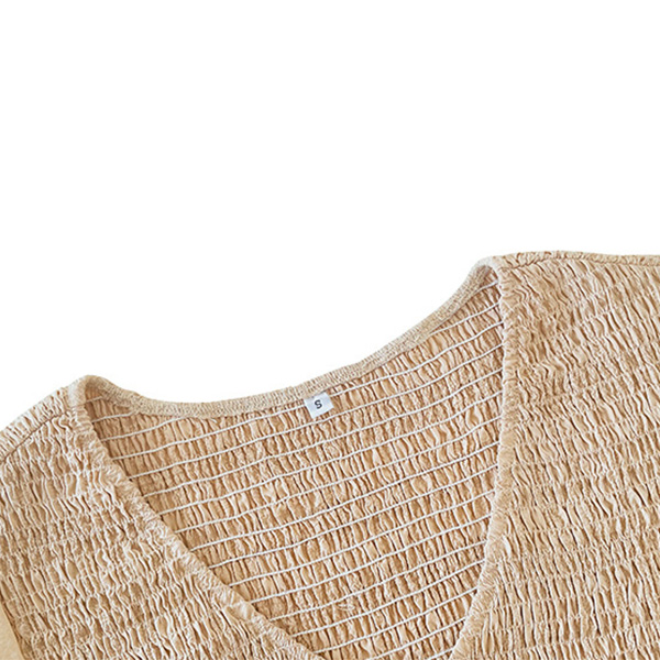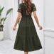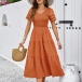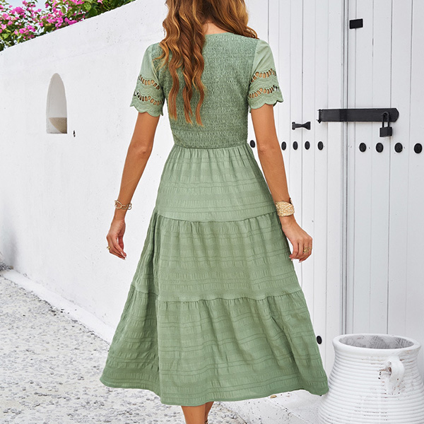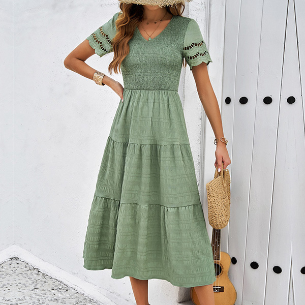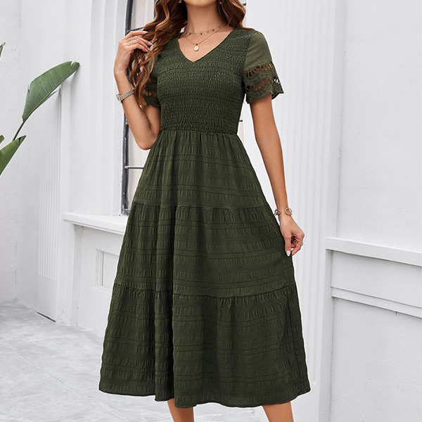 Fashion Solid Color V-neck Short Sleeve Smocked Bodice Tiered Dress
