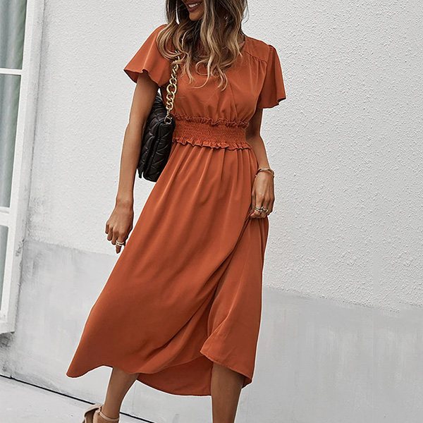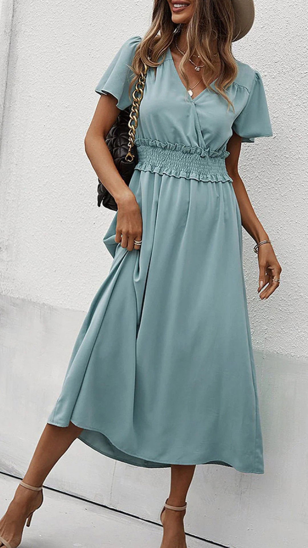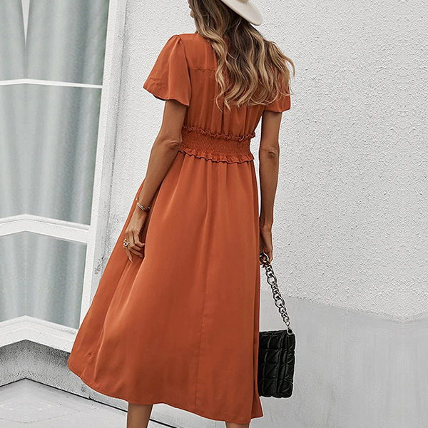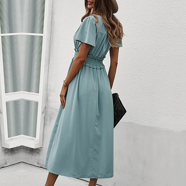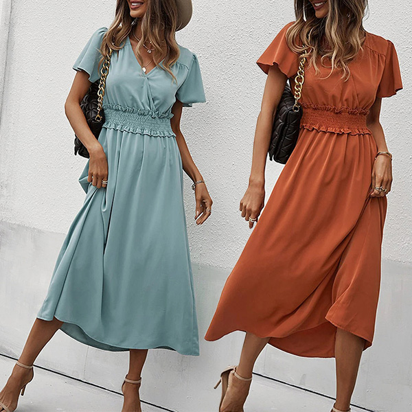 Fashion Solid Color V-neck Short Sleeve Smocked Waist Midi Dress