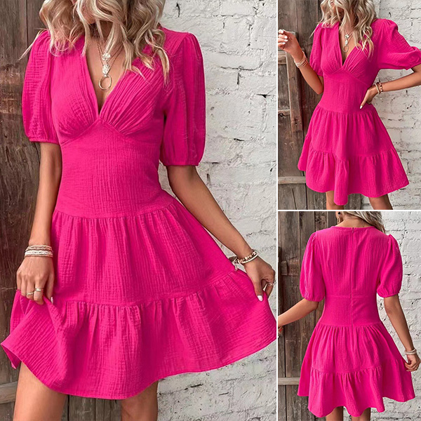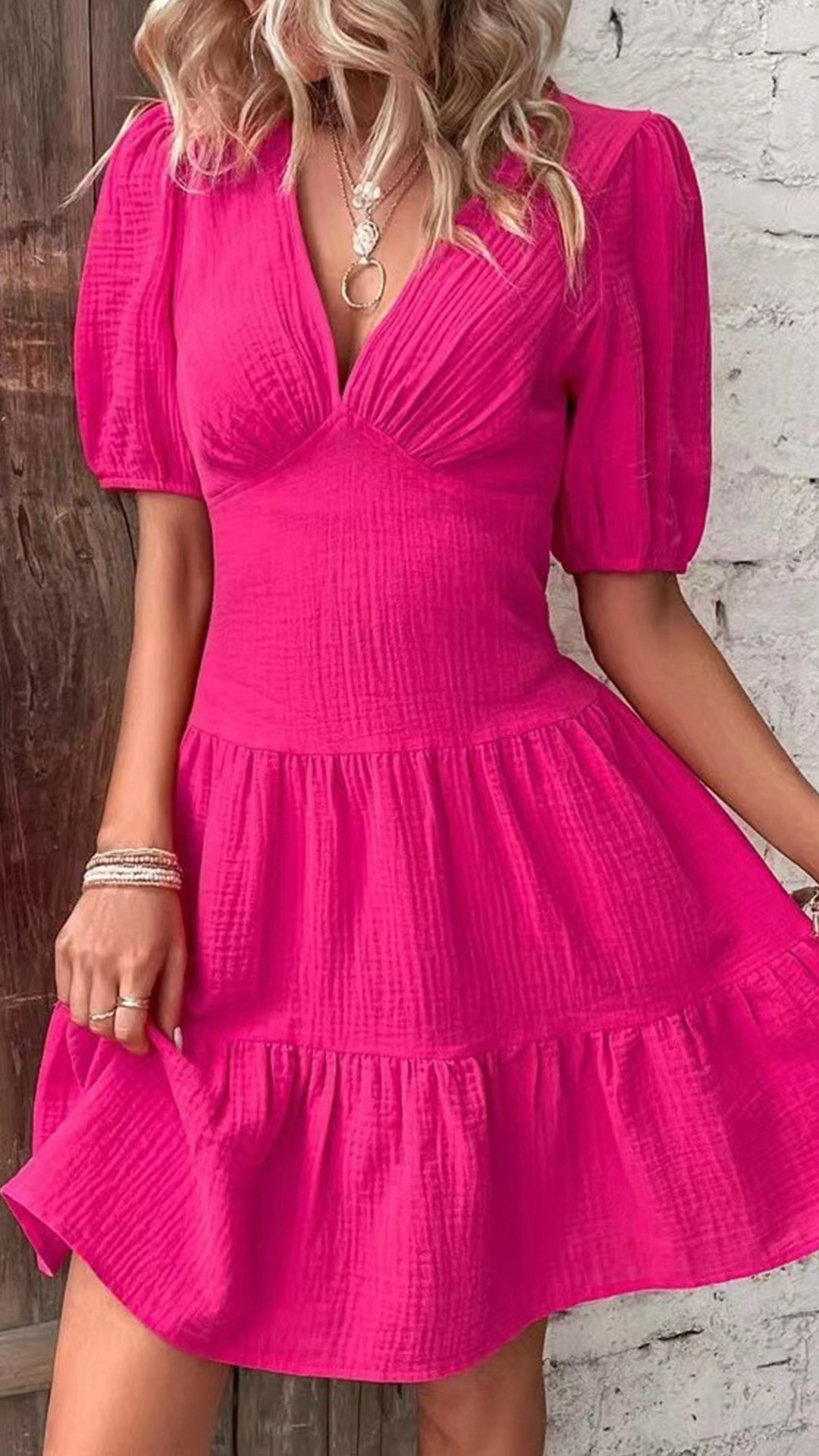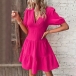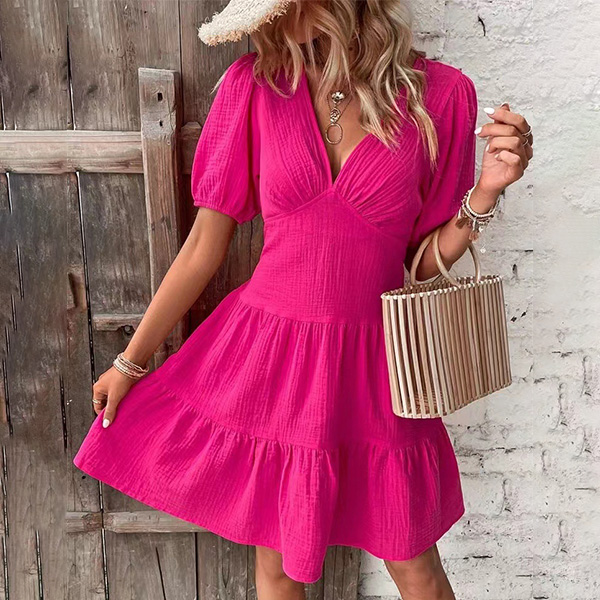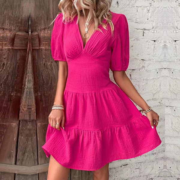 Fashion Solid Color V-neck Short Sleeve Tiered Dress