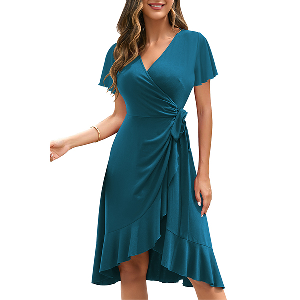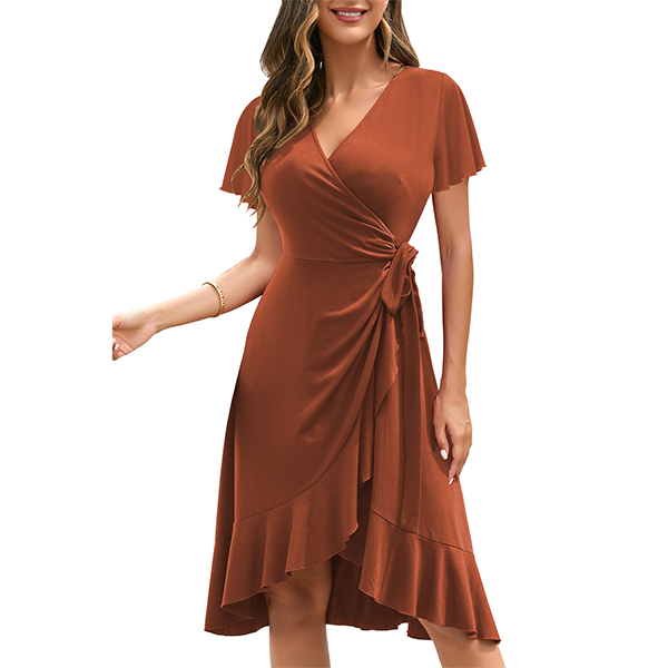 Fashion Solid Color V-neck Short Sleeve Wrap Dress