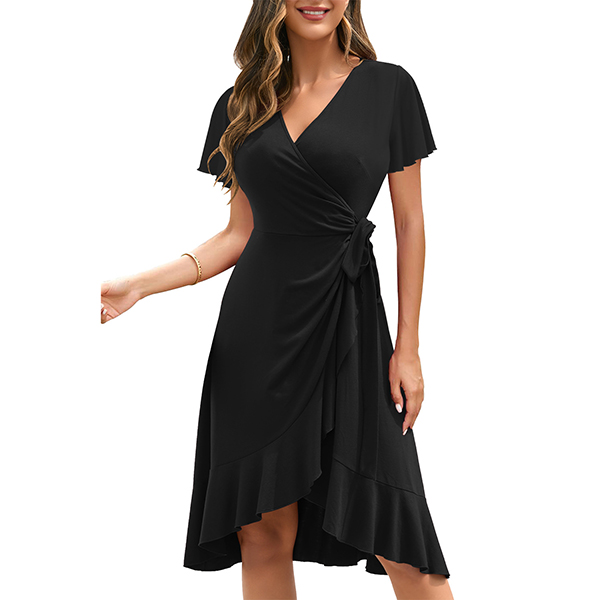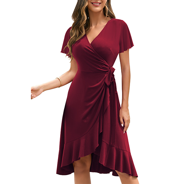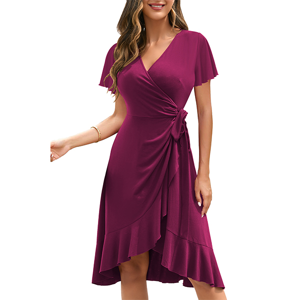 This mini dress features a solid color, V-neckline, short sleeves, and a wrap design for a fashionable and flattering look.