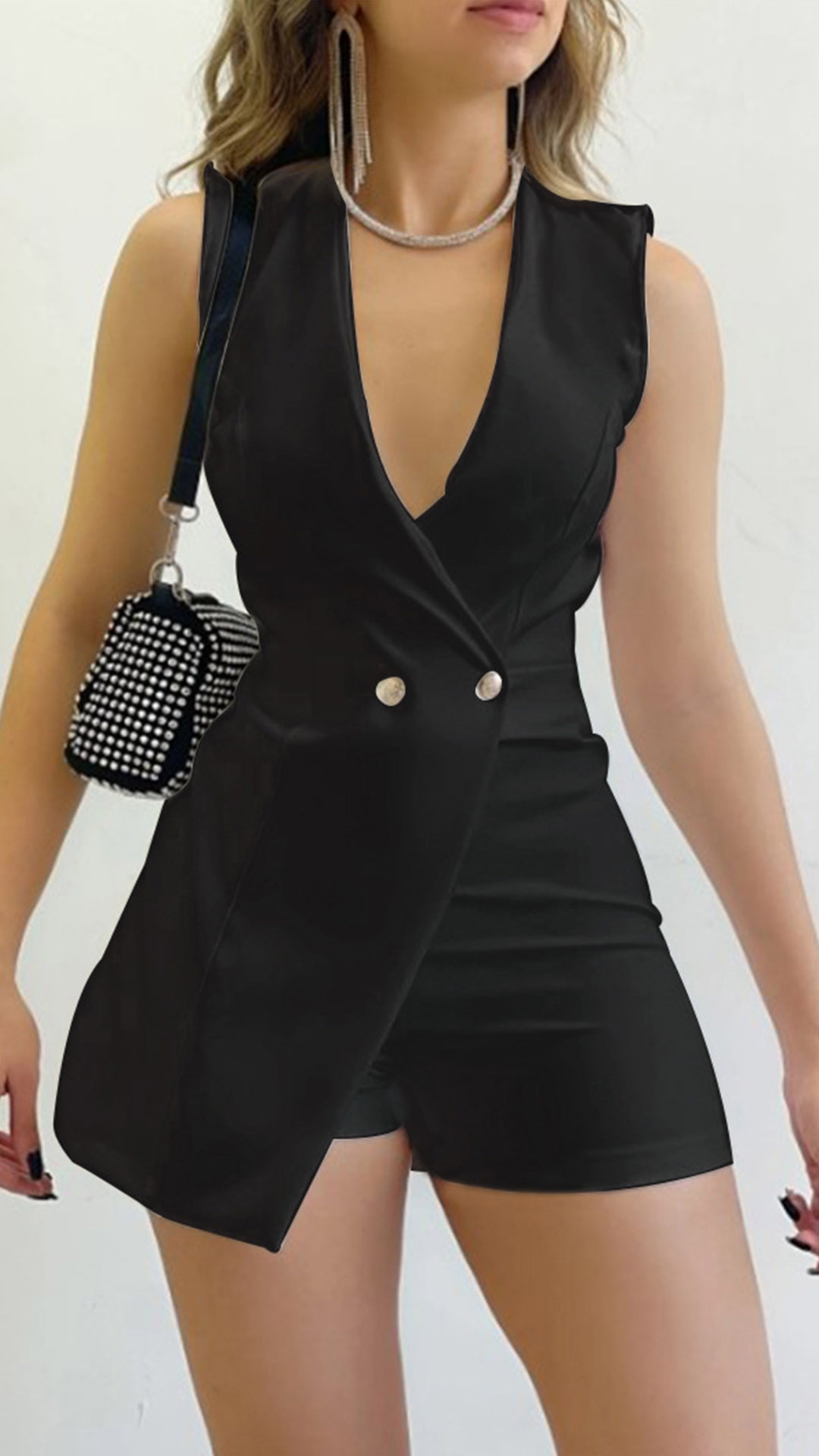 This is a chic and versatile piece that combines a solid color design, a V-neckline, a sleeveless silhouette, a double-breasted front, and a skort (shorts with a skirt overlay) style for a fashionable and trendy look.