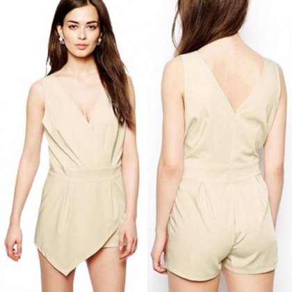 Fashion Solid Color V-neck Sleeveless Irregular Hem Rompers