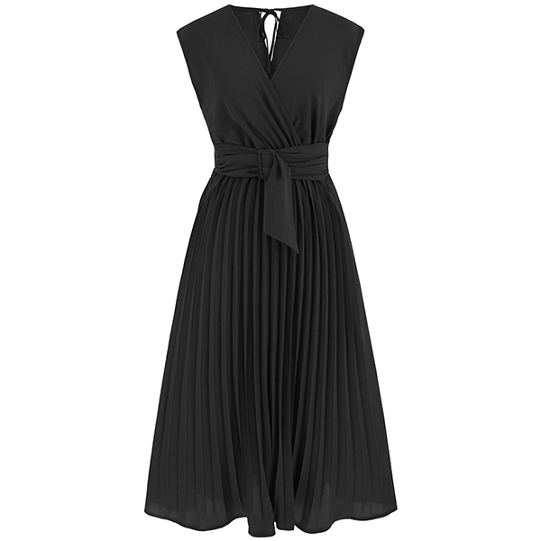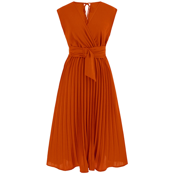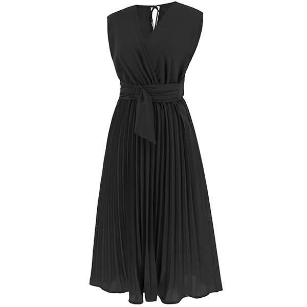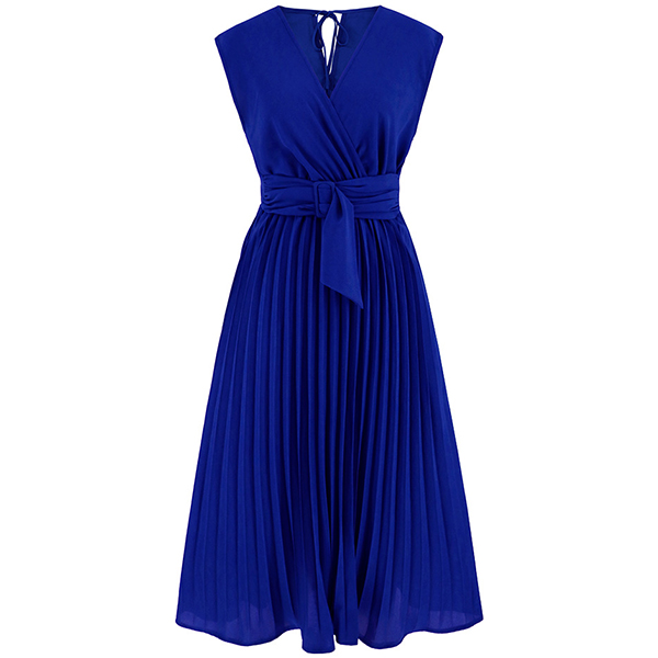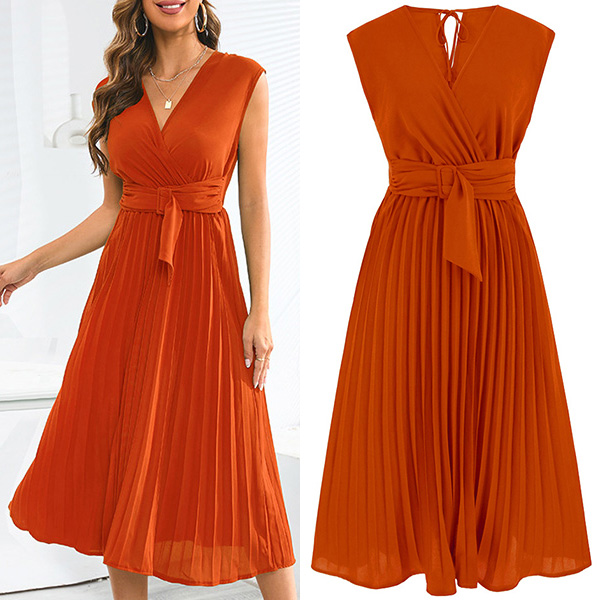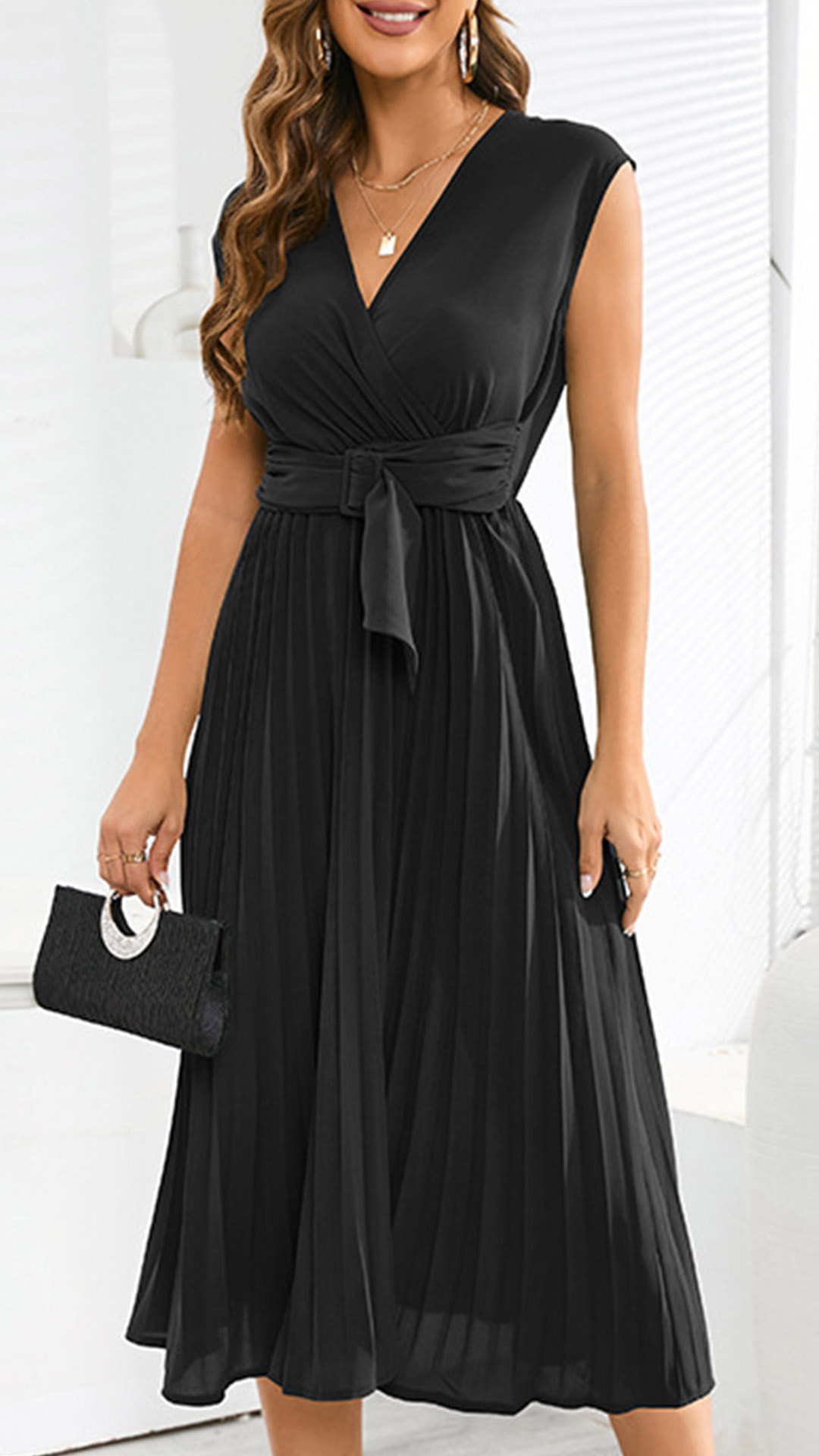 How about this dress? This dress features a flattering V-neckline, self-tie detailing at the waist cinches your figure and accentuates your curves, while the pleated skirt flows gracefully down to the mid-calf length. Whether you're attending a wedding, a formal event, or a summer party, this dress will make you feel confident and beautiful.