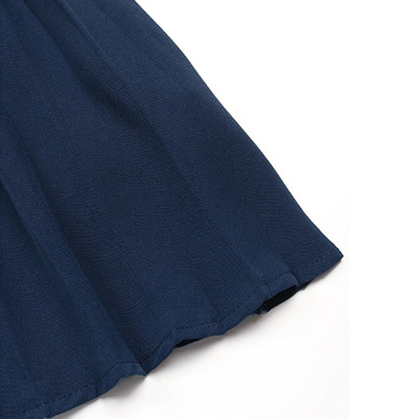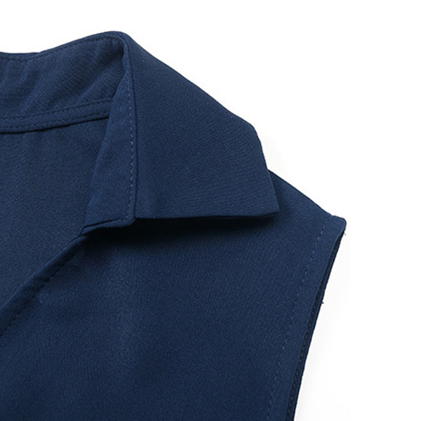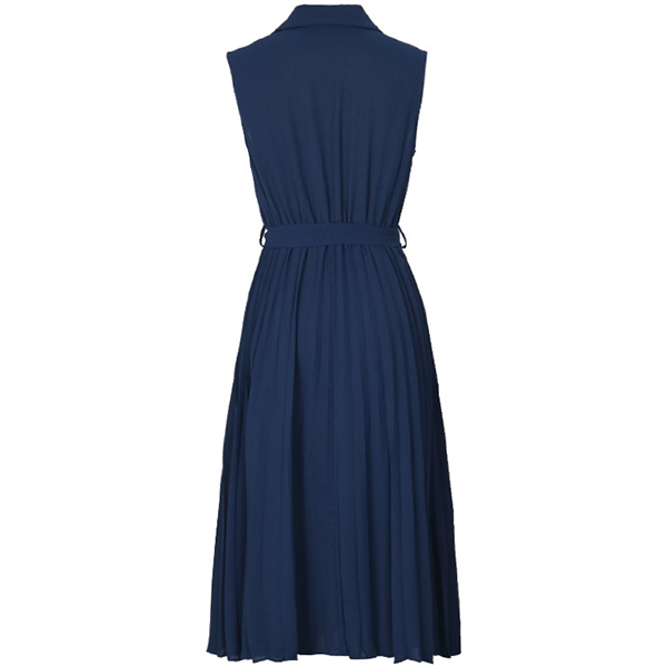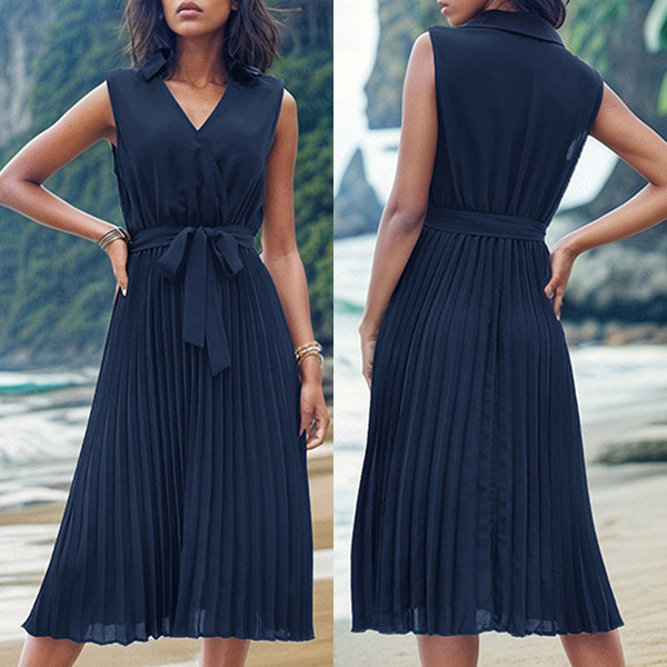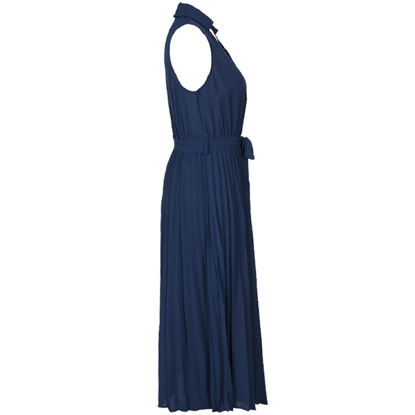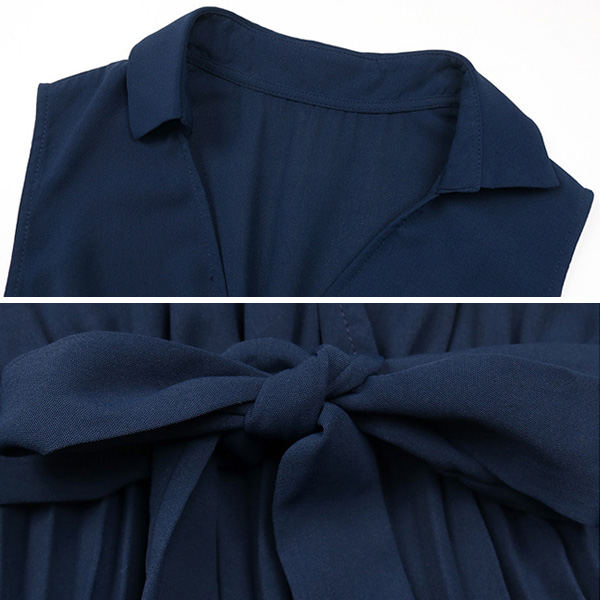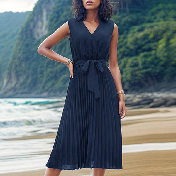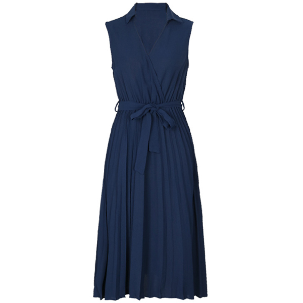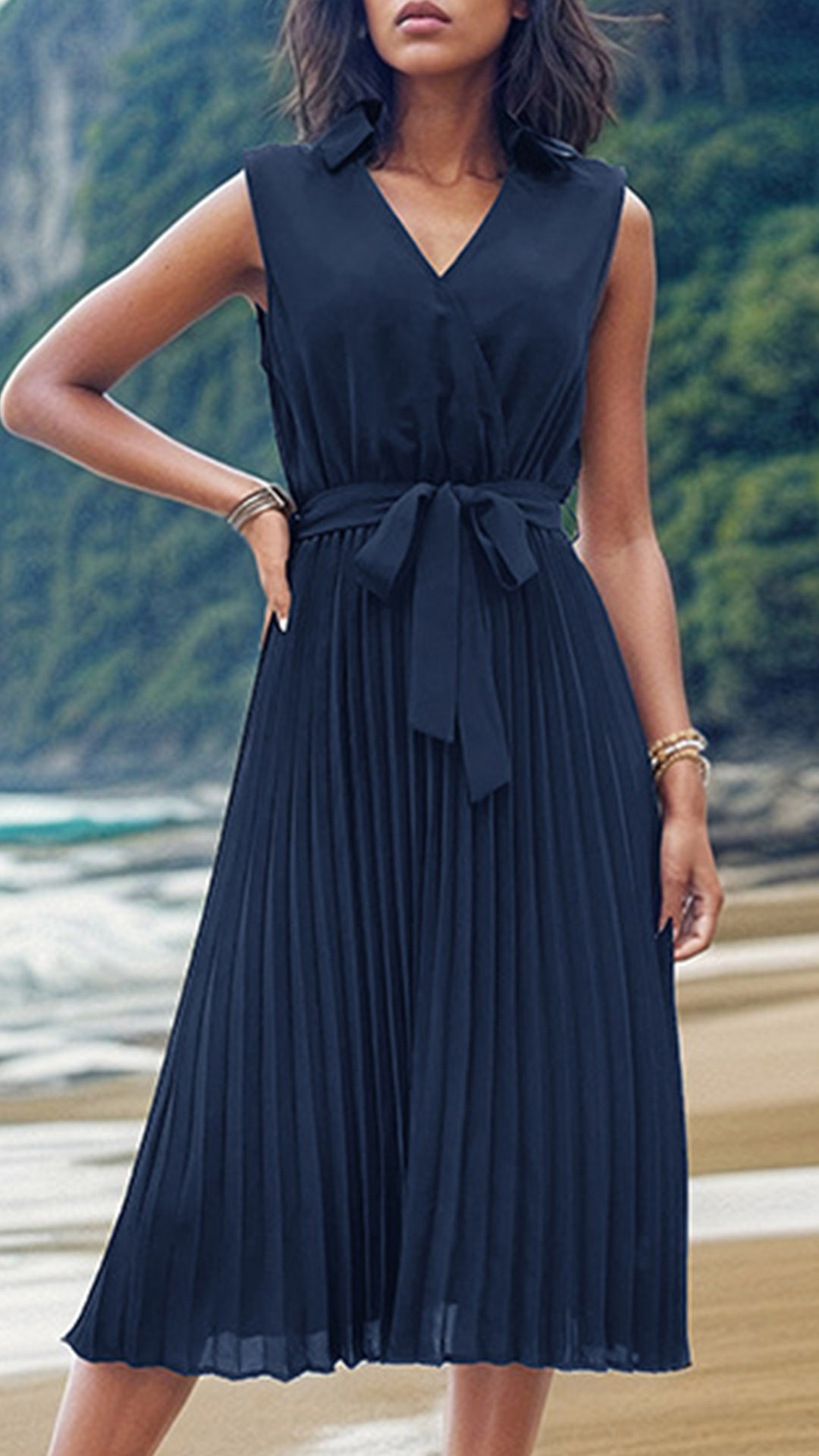 Fashion Solid Color V-neck Sleeveless Self-tie Pleated Dress