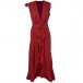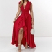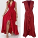 This is an elegant and chic derss that exudes sophistication and style. It features V-neck, sleeveless, self-tie waist, and ruffle slit design. Perfect for a special occasion, a formal event, or a romantic evening out.