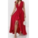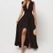 Fashion Solid Color V-neck Sleeveless Self-tie Ruffle Front Slit Maxi Dress