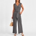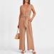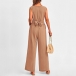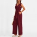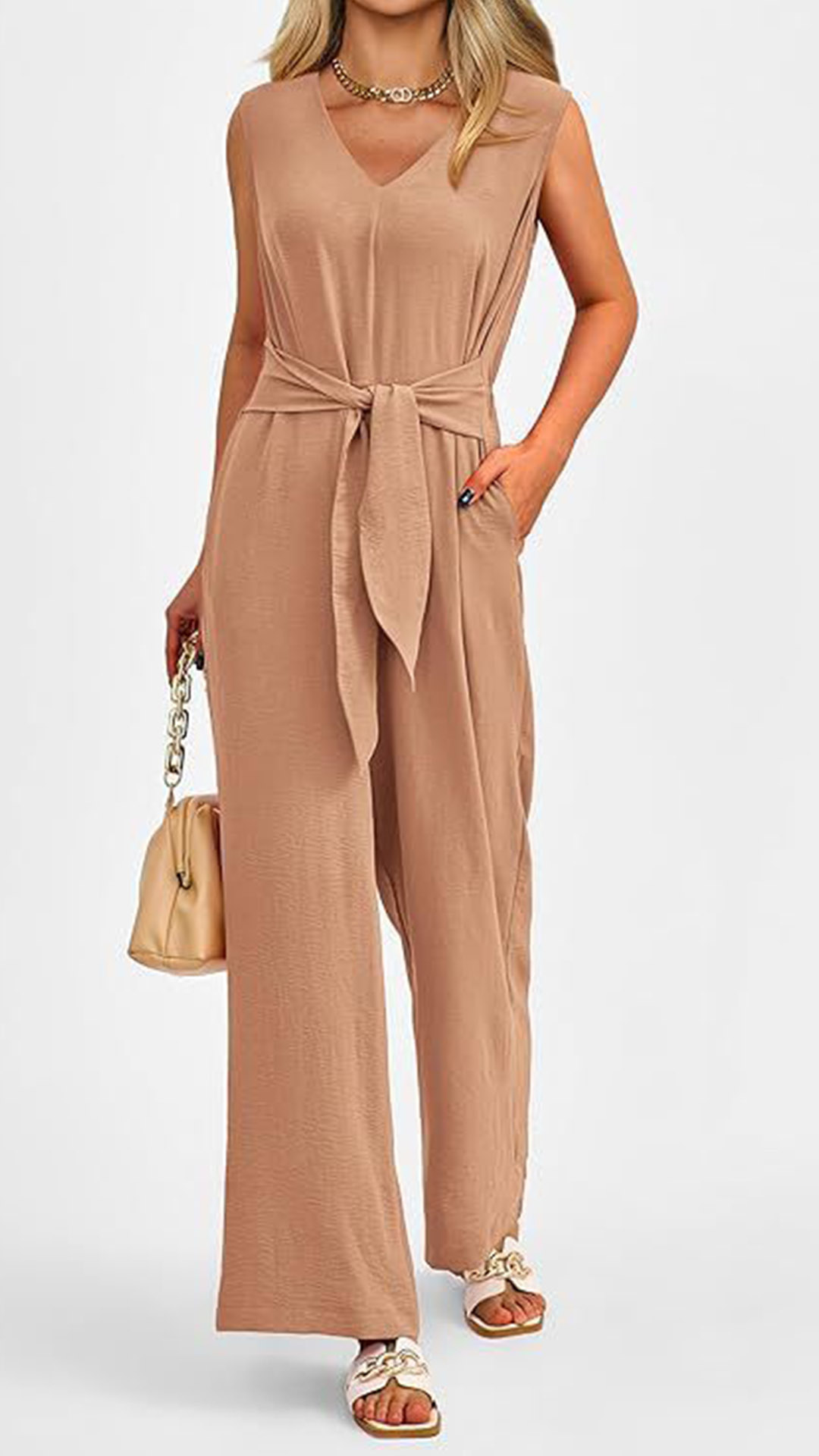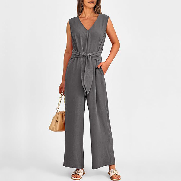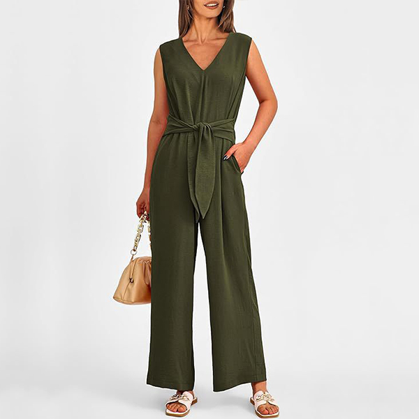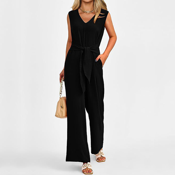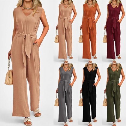 This versatile jumpsuit features a v-neckline, sleeveless design, self-tie waist, side pockets, and a straight-cut silhouette, creating a chic and effortless look in a solid color. Multi-colors avabile.