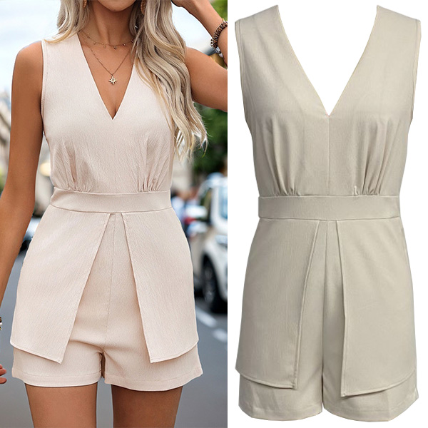 This romper features a flattering V-neckline, sleeveless design, and a front slit, creating a chic and fashionable ensemble that is perfect for warm weather and sunny days.