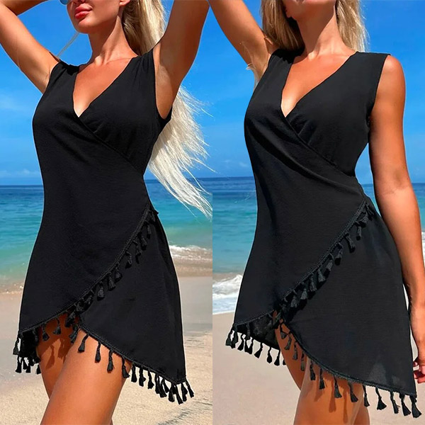 How about this dress? It features a flattering V-neckline and sleeveless design, creating a simple yet chic look that is both comfortable and stylish. The tassel detailing adds a playful touch to the dress, while the irregular hemline creates a unique and eye-catching silhouette. Wanna have one?