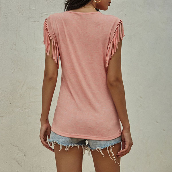 Not only can give you a comfortable day,but also can exude your style and personality,that's why we suggest you this t-shirt. Solid color style,the unique v-neck and tassel sleeve design make this piece look so distinctive and attractive. So why not take interest in it?