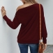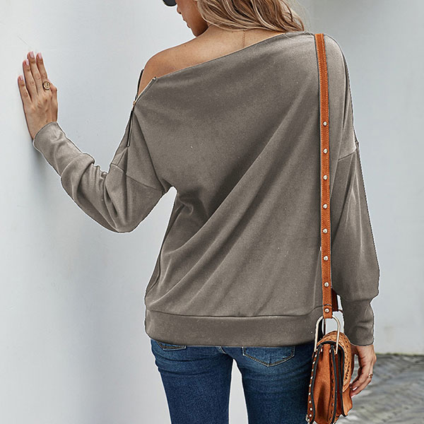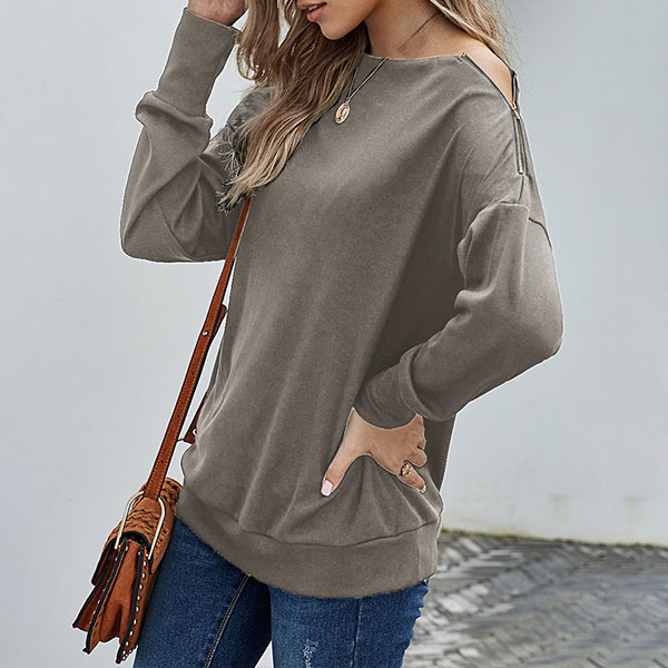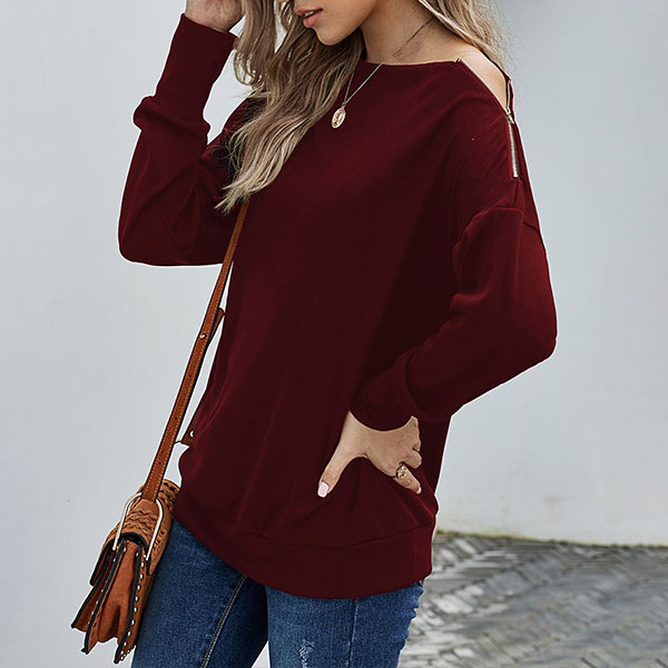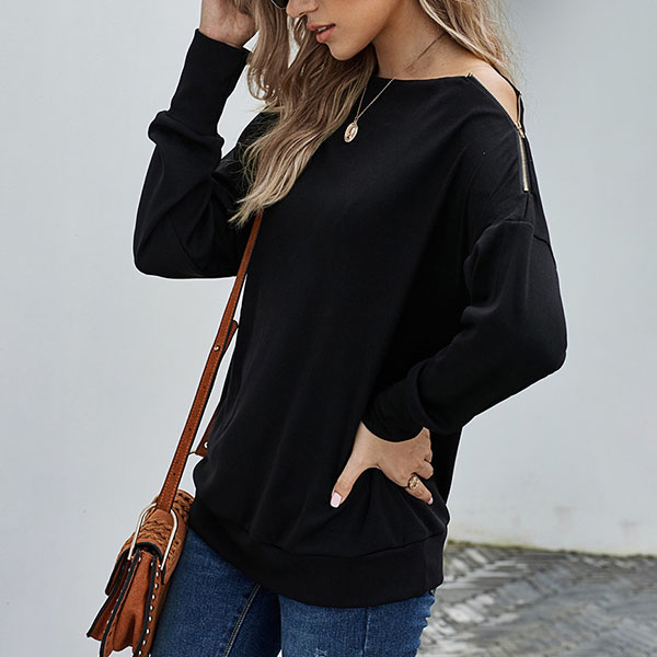 Fashion Solid Color Zipper Long Sleeve Round Neck Top