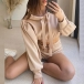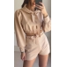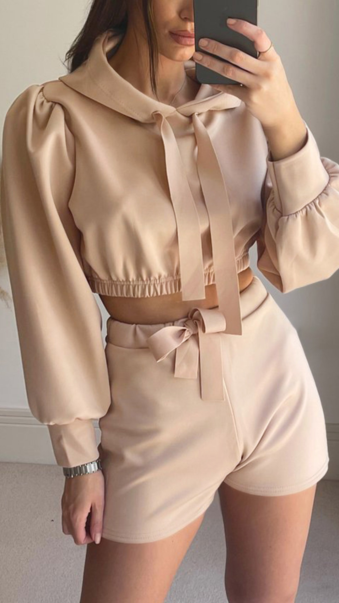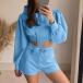 This fashionable sporty two-piece set consists of a crop hoodie and shorts, creating a trendy and coordinated look. The crop hoodie features a cropped length and a drawstring hood, giving it a sporty and casual vibe. The shorts are designed for comfort and mobility, making them perfect for active wear or lounging.