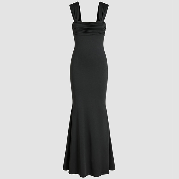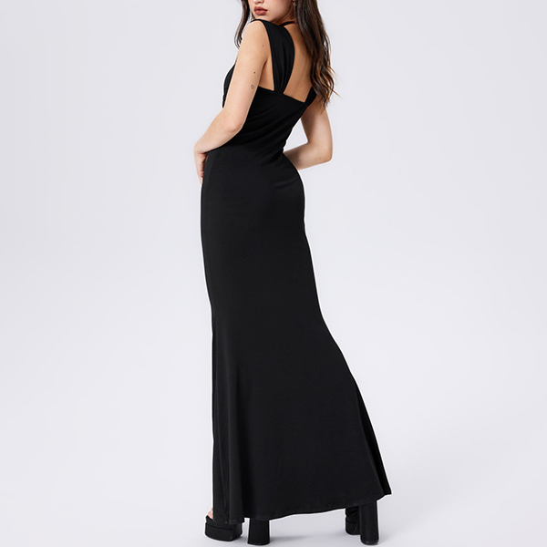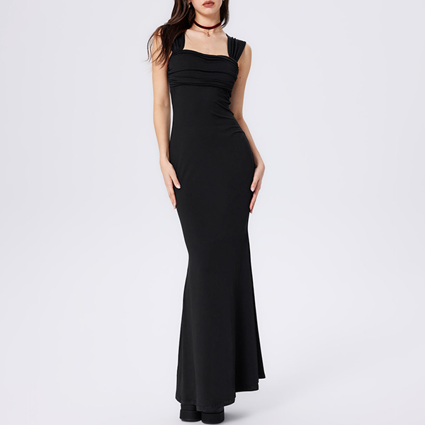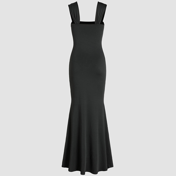 This maxi black dress features a square neckline with a bodycon silhouette for a fashionable and elegant look.