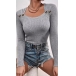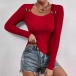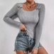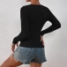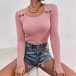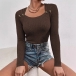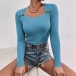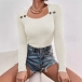 Fashion Square Neck Button Long Sleeve Ribbed Shirt