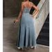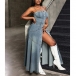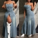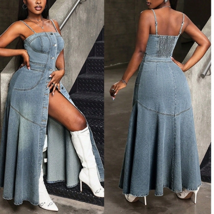 Fashion Square Neck Front Button Slit Maxi Denim Dress