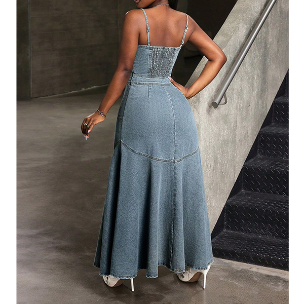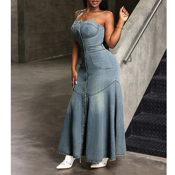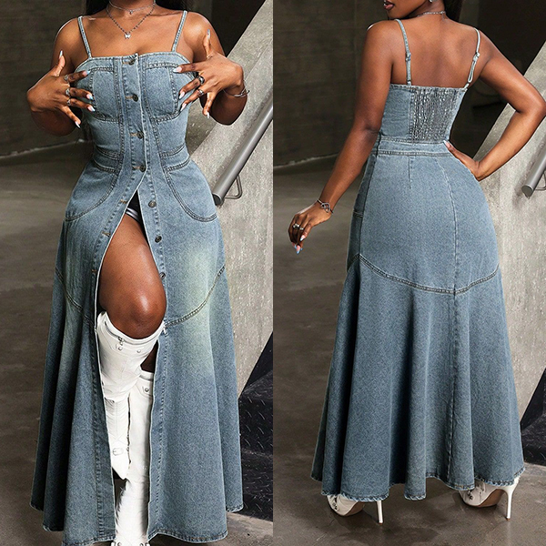 This Maxi Denim Dress combines timeless denim charm with sophisticated design elements. The structured square neckline frames your décolletage with architectural precision while adding a contemporary touch to the classic silhouette. Front buttons run the length of the dress, providing both decorative detail and practical functionality for adjustable coverage and ease of wear. The strategic slit creates movement and visual interest, allowing for comfortable stride while adding a subtle touch of allure. Wanna have a try?