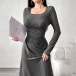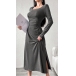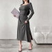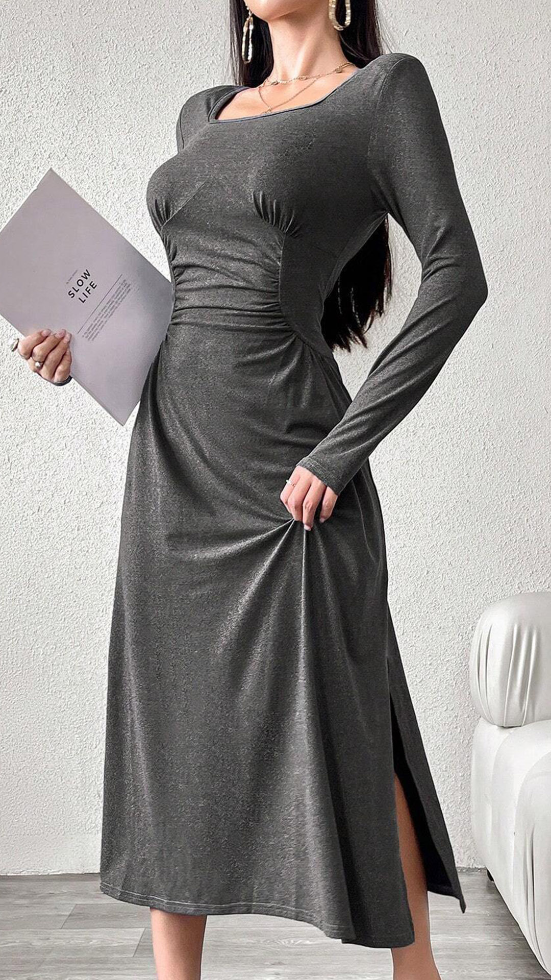 This stylish and sophisticated dress features a square neckline that adds a modern and chic touch to your look. The long sleeves provide coverage and warmth, making it perfect for cooler weather. The cinched waist creates a flattering silhouette, while the side slit adds a touch of allure and movement. The maxi length adds an elegant and graceful flair, perfect for any special occasion or event. Hope you like it.