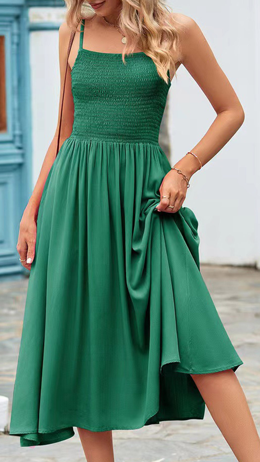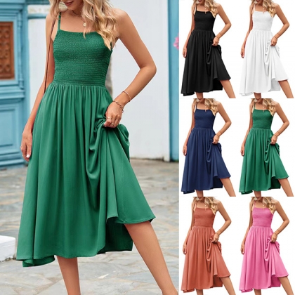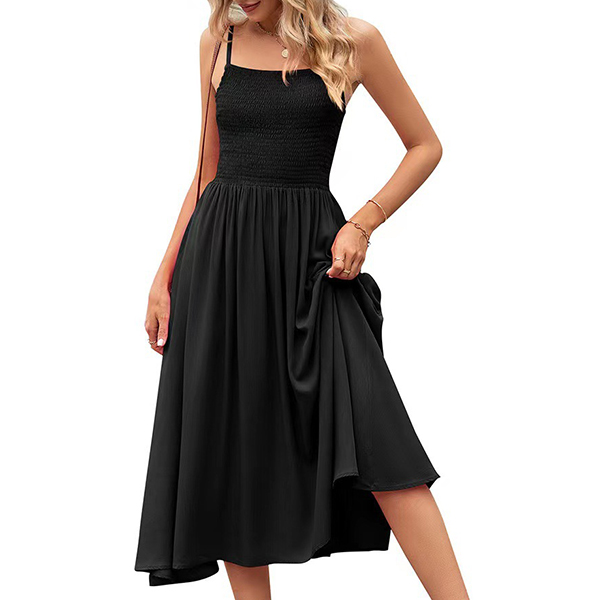 This chic slip dress featurs square neck, smocked bodice for perfect fit, side pockets and pleated hemline. It combines modern, on-trend design elements with a timeless, effortless silhouette. Wanna have a try?