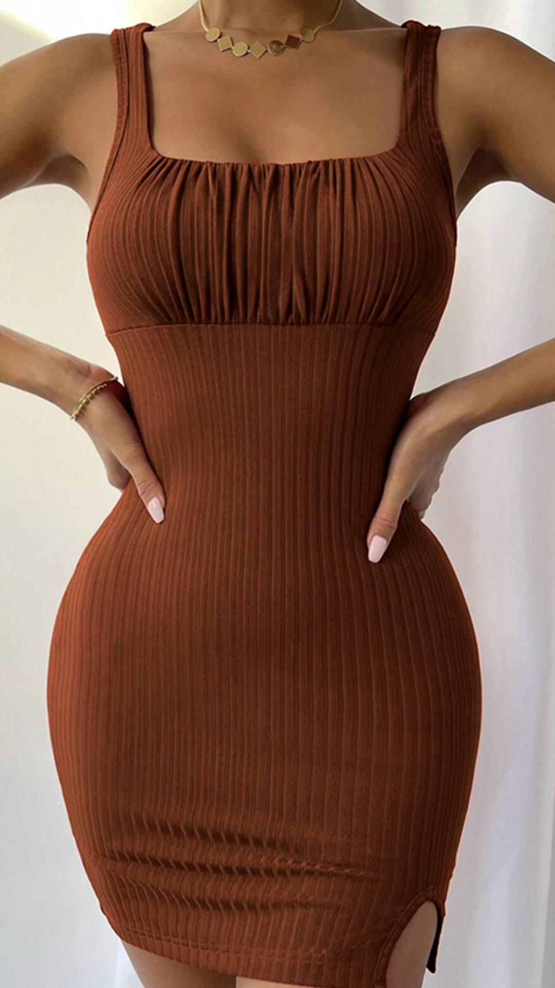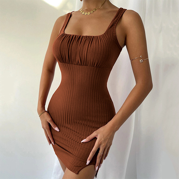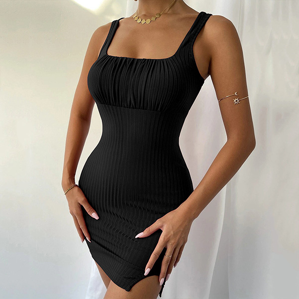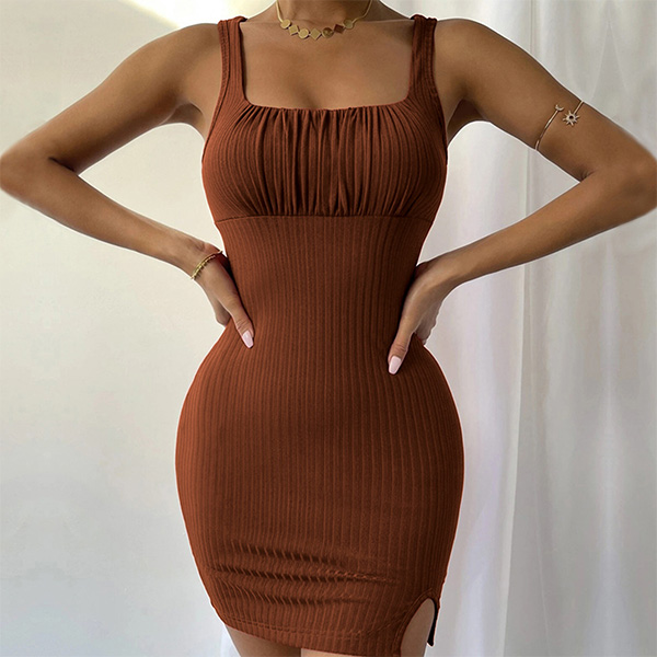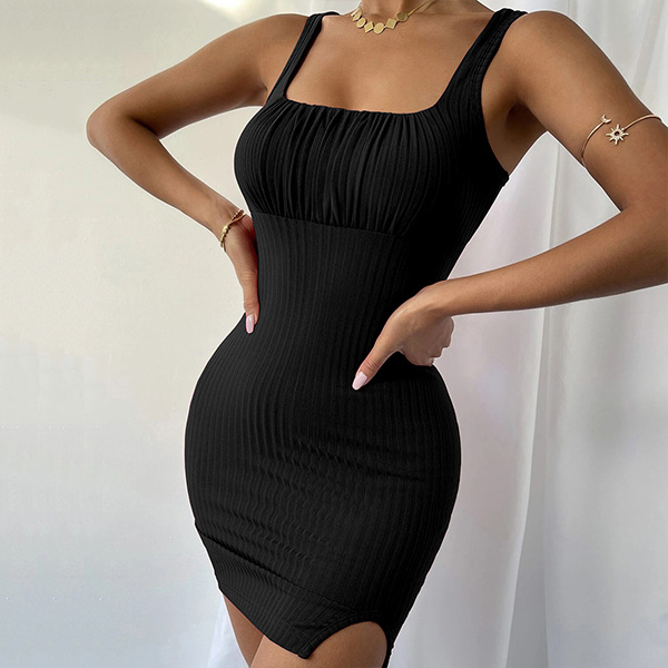 Fashion Square Neckline Ruched Ribbed Slit Bodycon Dress