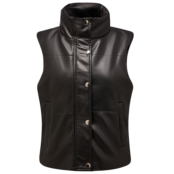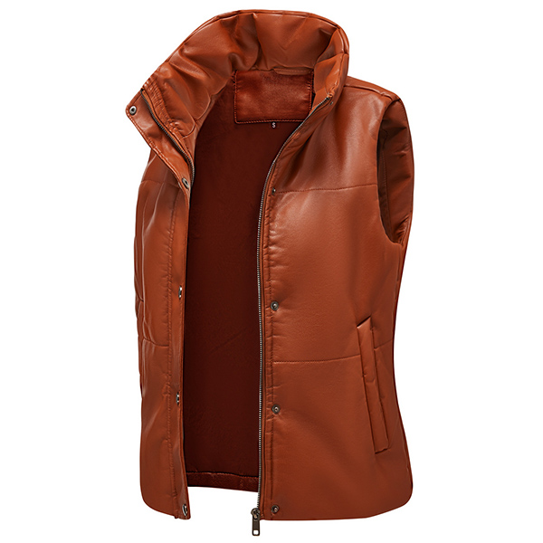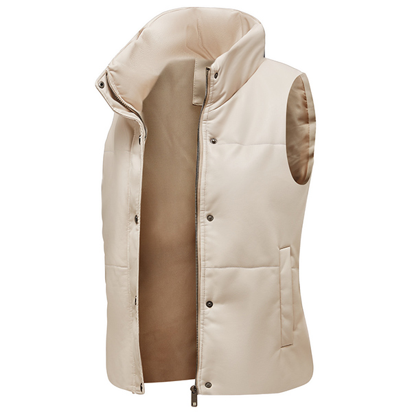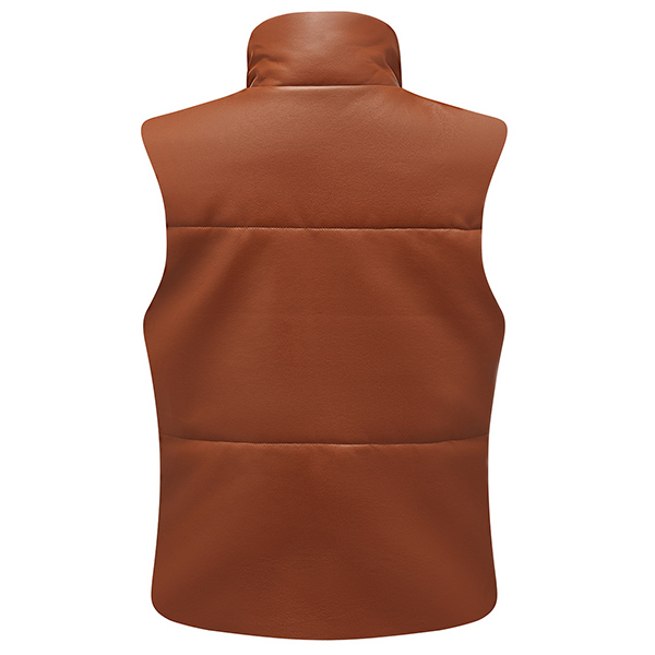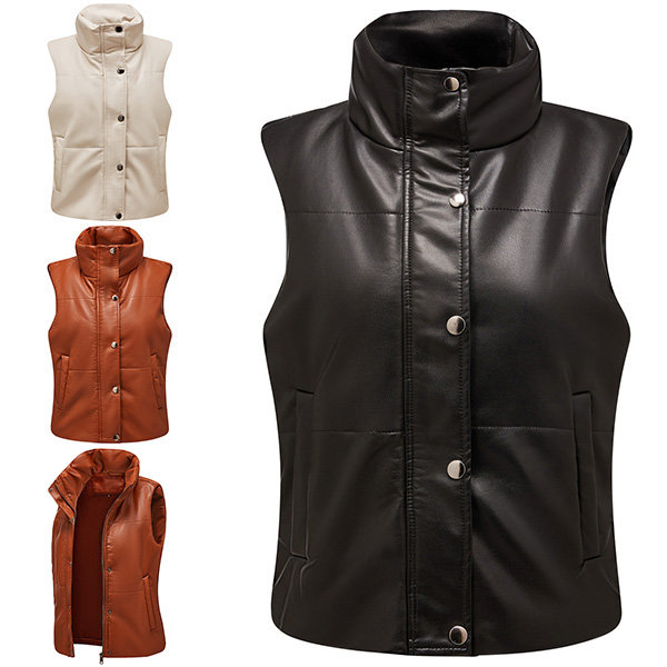 This is a stylish and warm vest jacket made from artificial leather and quilted fabric. It has a stand collar for a chic look, and the PU material is both durable and stylish. The vest is lightly padded for warmth, and has two pockets for your hands or for storing small items.