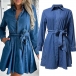 Fashion Stand Collar Buttoned Long Sleeve Self-tie Side Pockets Denim Dress