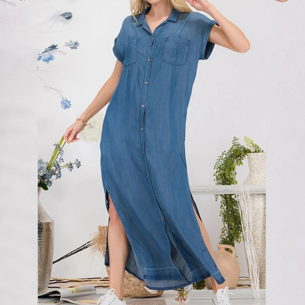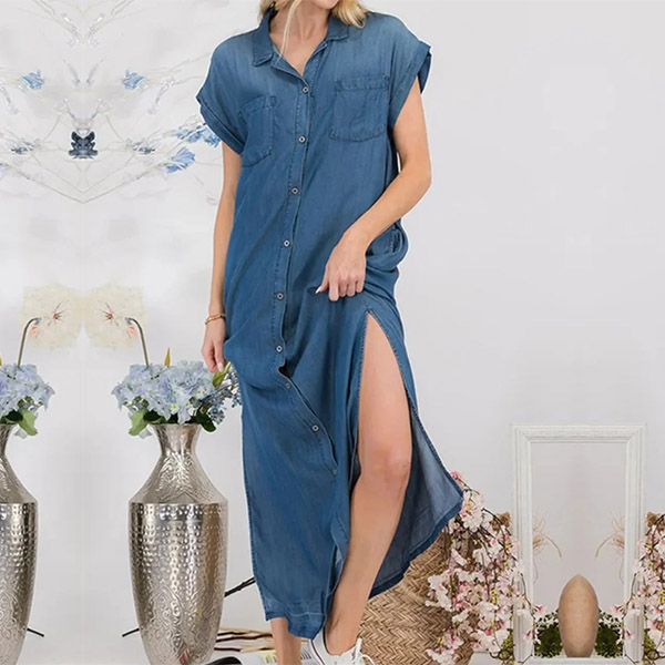 This dress combines the timeless appeal of denim with a modern and stylish design. The stand collar adds a touch of sophistication, while the buttoned front adds a classic and polished look. The slit detail adds a hint of playfulness and movement, creating a chic and trendy silhouette. Whether you're going to a brunch date, a casual outing, or a weekend getaway, this Denim Dress is a stylish and versatile choice.