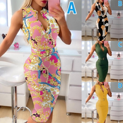 Looking for a versatile and stylish dress that can take you from the office to a night out on the town? Look no further than this chic bodycon dress! Featuring a stand collar, buttoned front, and sleeveless design, this dress is perfect for a variety of occasions.