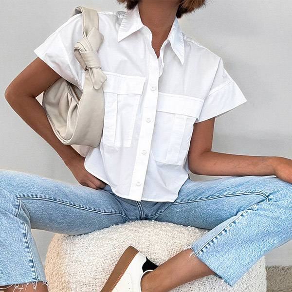 Elevate your style with this fashion-forward crop blouse. The stand collar adds a touch of sophistication and elegance, while the cap sleeves give the blouse a unique and trendy look. The cropped length is flattering and on-trend, making this blouse a versatile piece that can be dressed up or down. We could wear it with jeans for a more casual yet fashion-forward look.