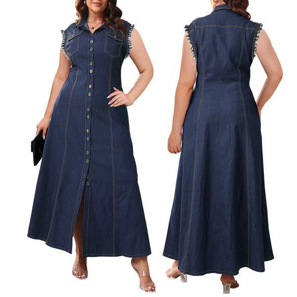 This is a stylish and edgy denim dress that exudes a cool and contemporary vibe. The frayed detailing on the sleeves adds a trendy and edgy touch, adding a touch of urban flair to the overall design. Crafted from denim fabric, this maxi dress offers a versatile and on-trend look that is perfect for both casual outings and more dressed-up occasions. Wanna have a try?