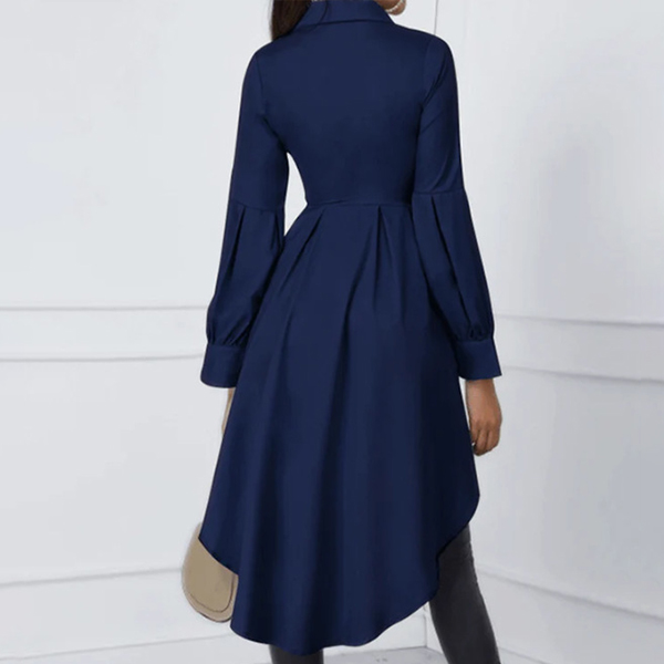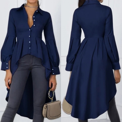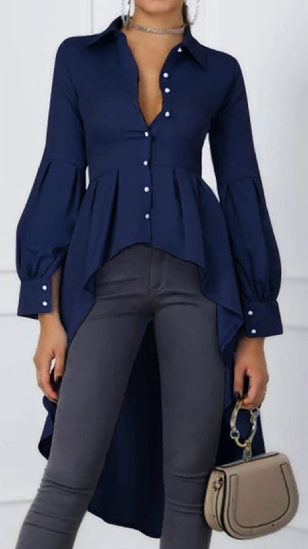 Look at this shirt! It features a stand collar, front button closure, long sleeves, and a high-low hemline for a chic and contemporary look. Pair it with tailored pants or a skirt for a professional and sophisticated look.
