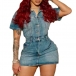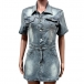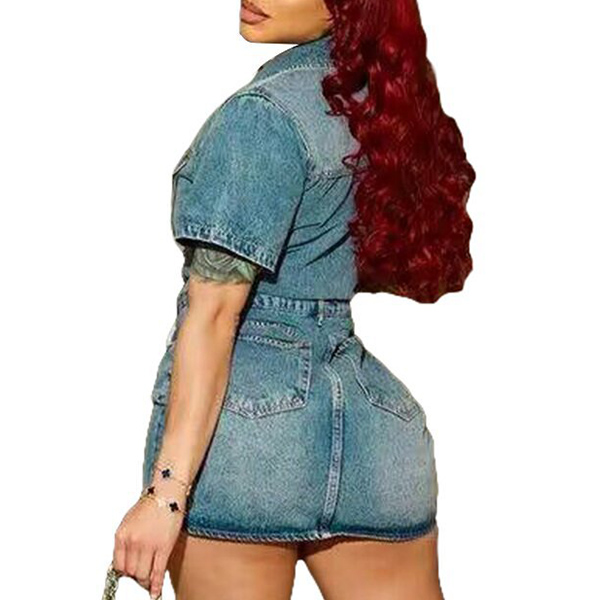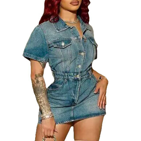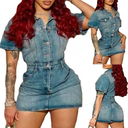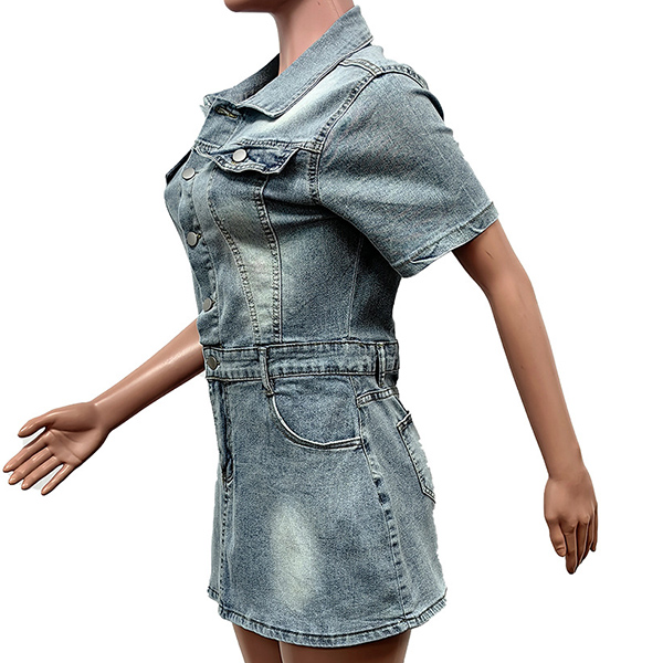 Fashion Stand Collar Front Button Short Sleeve High-rise Old-washed Denim Dress